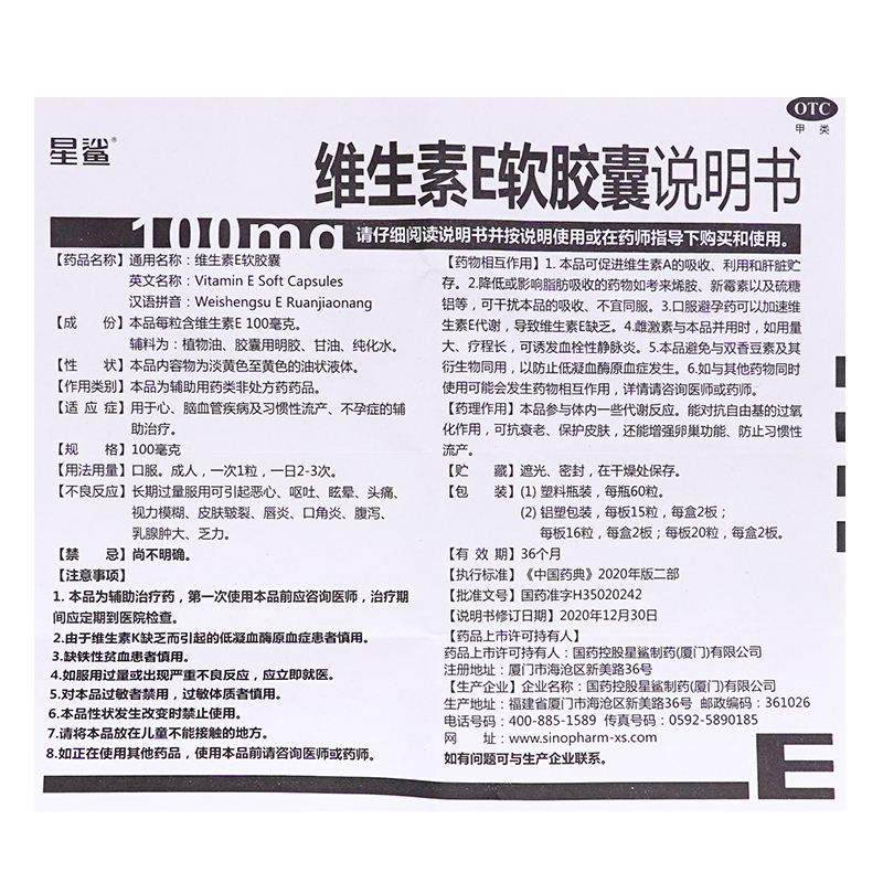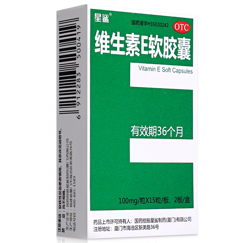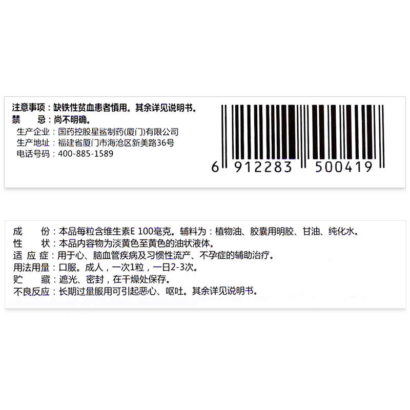 | 成分 | 本品每粒含维生素E100毫克,辅料为:植物油、胶囊用明胶,甘油,纯化水。 |