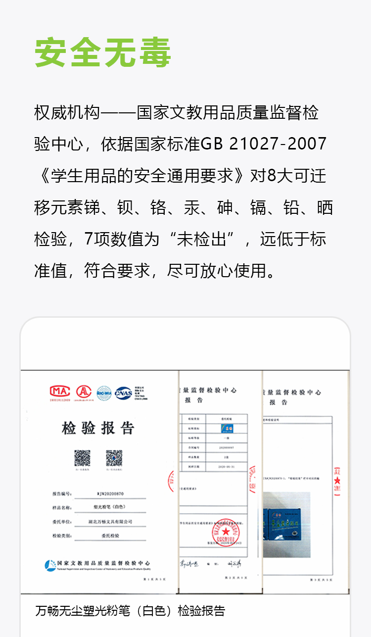 亲,关于无毒,我们的粉笔在制作的过程中没有添加任何其他的化学物质。当然再无毒也不能吃的哦。关于无尘,因为粉笔在写字时摩擦力和分子之间的引力共同作用的结果,产生了粉末。【引力是指黑板和粉笔分子之间的比】无尘粉笔与普通粉笔,所不同的是,在粉笔中加入了吸湿性较强的物质,以降低粉尘的飞扬。其原料也是没有添加有害物质。以前那种普通粉笔比起来粉尘少很多很多,以前在写字或者擦黑板的时候,粉笔灰四处飞扬,现在的无尘粉笔不会有这种现象的,当然没有绝对的无尘,那样就不是粉笔是木头了。