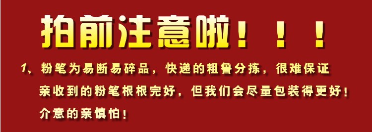 亲,用过粉笔的亲们都知道,粉笔是易碎易断的,但是我们家通过特殊的包装方式,尽量减少断裂,很多亲的评价说断得少,没有断,一根都没断,说明我们家的包装方式也是收亲们认可的。当然有个别亲说,全部断了,直接给一个中差评,不知道什么目的。快递的粗莽分拣确实会存在对粉笔这些敏感的商品很大的伤害,但是出现问题,我们都会给亲认真去解决,中差评其实受伤的还是你自己。
