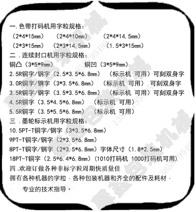 本公司提供各种打码机耗材字粒尺寸多种购买前请旺旺质询或电话联系!