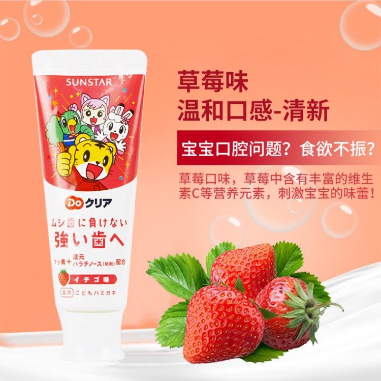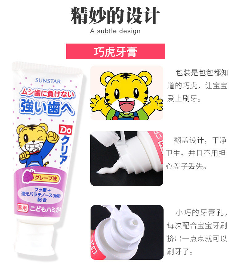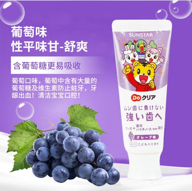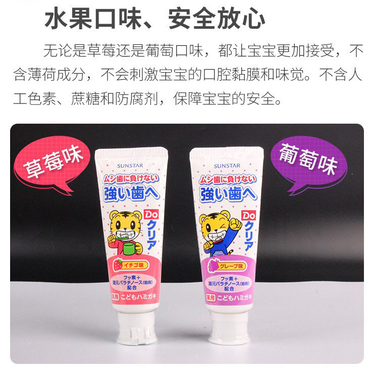 水果口味,不含薄荷成分,不会刺激宝宝的口腔黏膜和味觉,清洁牙齿,清新口气,阻止疾病的同时更考虑到宝宝的长远发展。色彩鲜艳,卡通包装,让宝宝更喜欢刷牙。