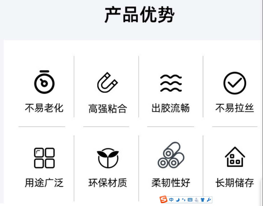 无毒害、操作方便,连续使用没有炭化现象 具有快速粘合,强度高,耐老化,无毒害,热稳定性好,胶膜韧性等.