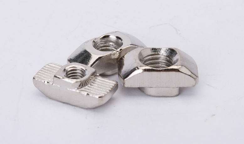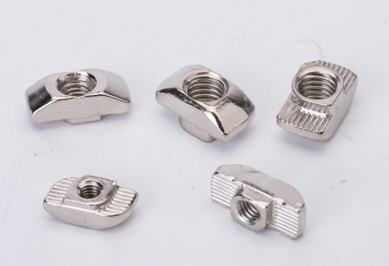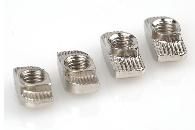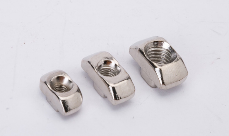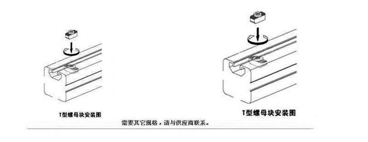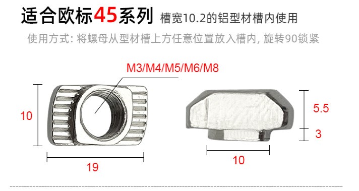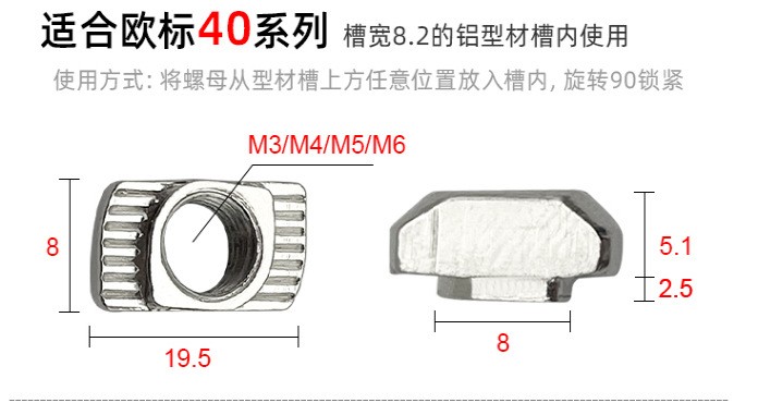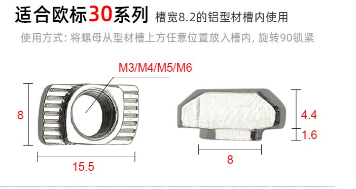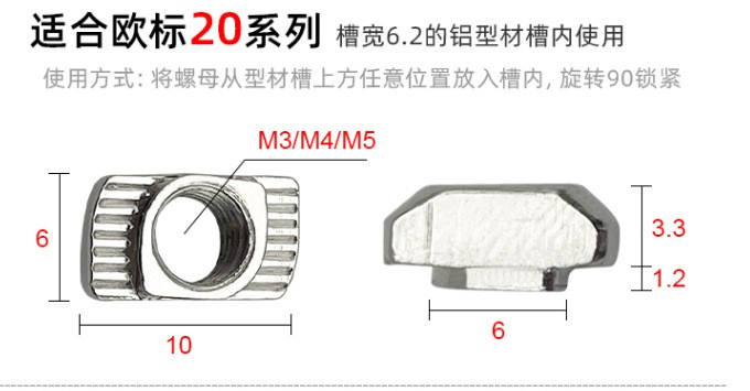 应用说明:欧标T型螺母是欧标型材(T型槽)的专用紧固件。将螺母头顺型材槽方向放入槽内,顺时针旋转90度,安装过程中它能自动定位锁紧, 常与内六角螺栓配合使用组装角件。