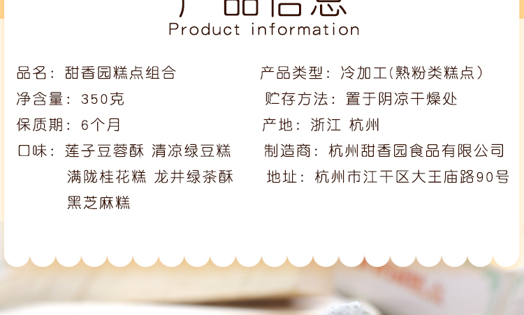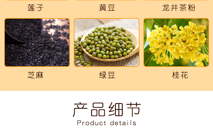 | Ингредиенты | Пшеничная мука, соевые бобы, мунг, черный кунжут, растительное масло, арахис, Lotus, порошок чая Лунцзин, съедобная соль, сахар |
