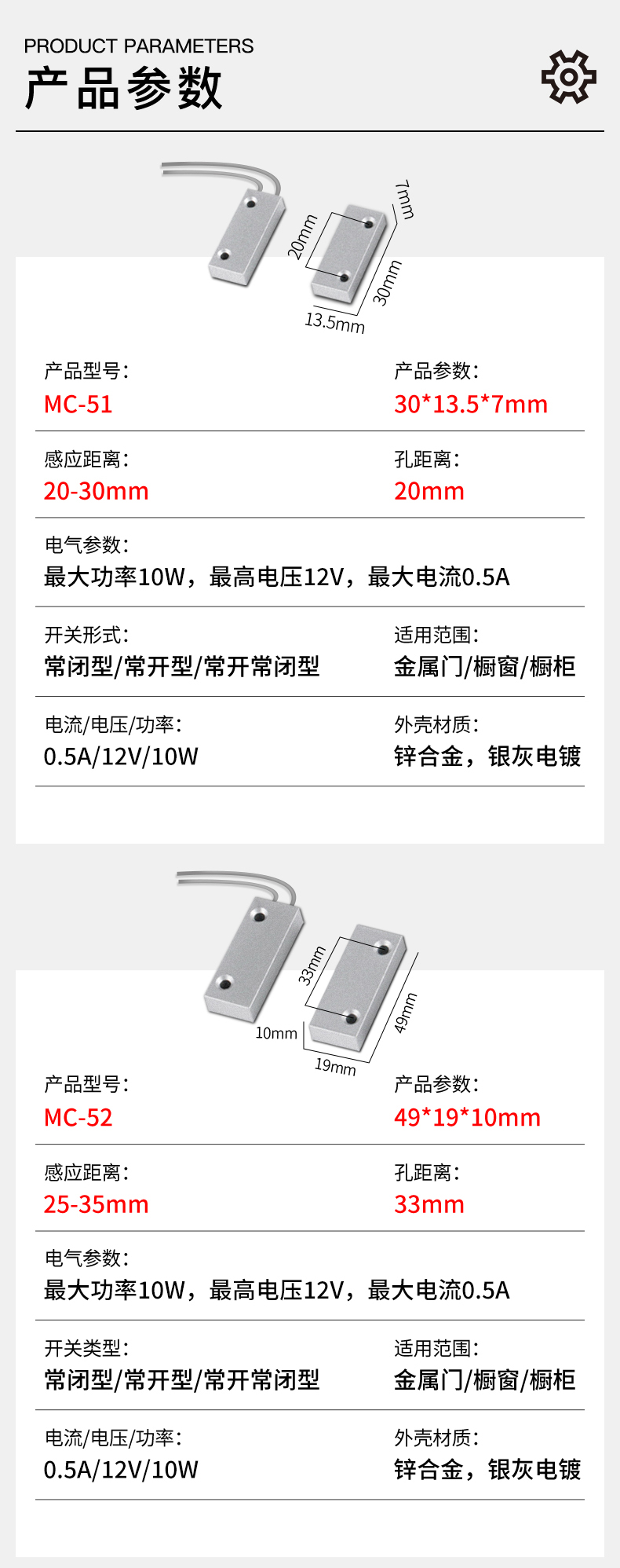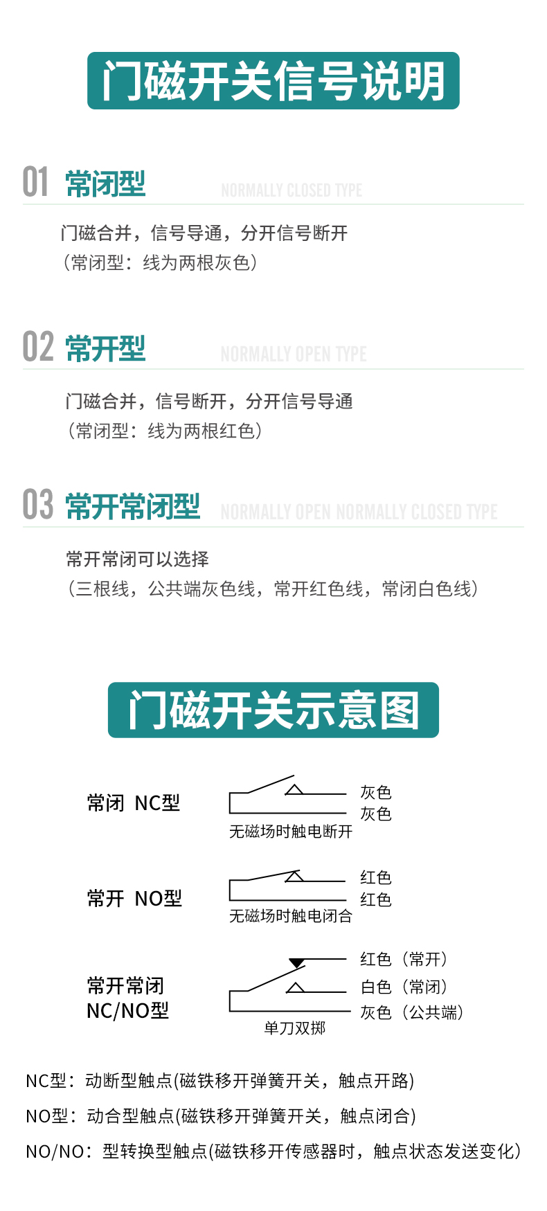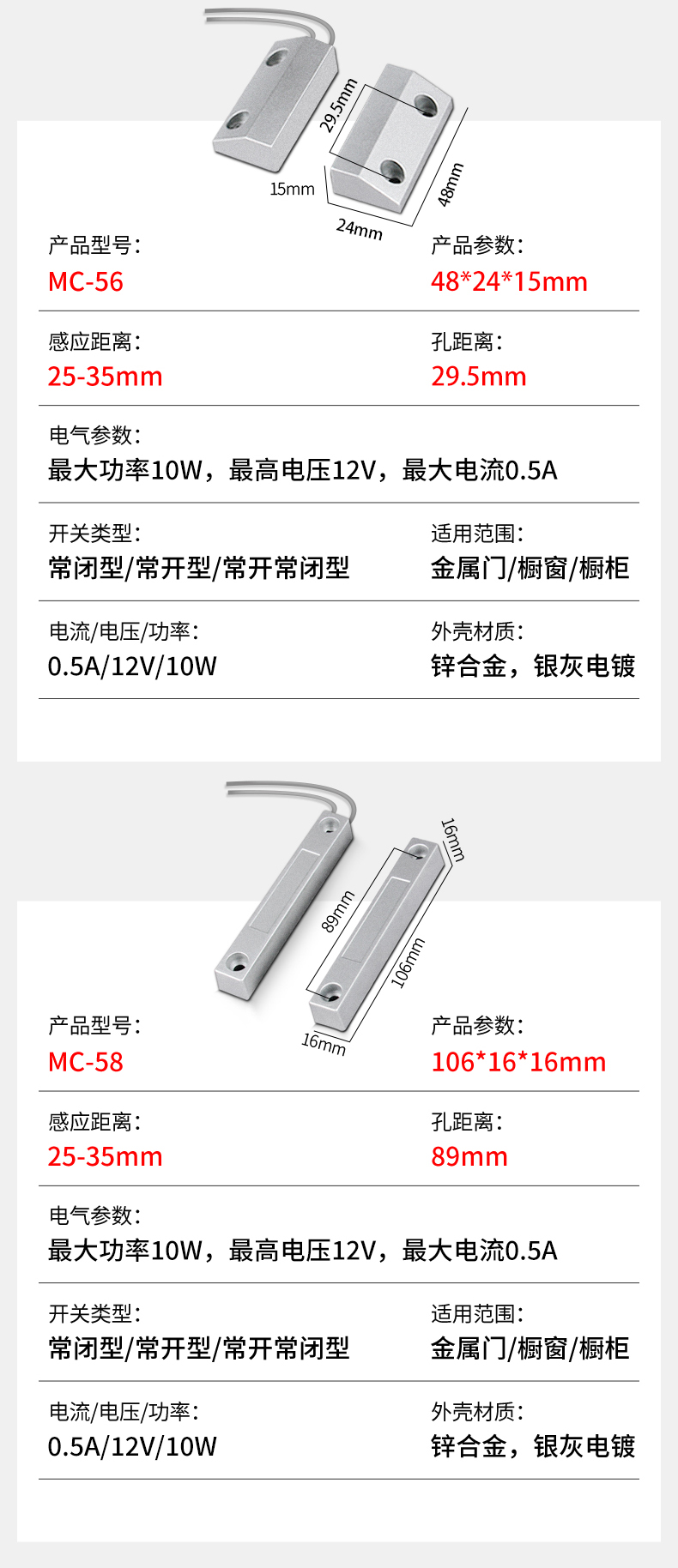 | Цветовые варианты | ---[Нормально замкнутый] Пассивный переключатель, сухой контакт---, MC-51 [НЗ] сигнал при замыкании, MC-52 [НЗ] сигнал при замыкании, MC-56 [НЗ] сигнал при замыкании, MC-58 [НЗ] сигнал при замыкании, MC-59 [НЗ] сигнал при замыкании, Магнит с двойной дверью [НЗ] сигнал при замыкании, ---[Нормально разомкнутый] Пассивный переключатель, сухой контакт---, MC-51 [НО] сигнал при размыкании, MC-52 [НО] сигнал при размыкании, MC-56 [НО] сигнал при размыкании, MC-58 [НО] сигнал при размыкании, MC-59 [НО] сигнал при размыкании, Магнит с двойной дверью [НО] сигнал при размыкании, [НО и НЗ] Трехпроводной пассивный переключатель, сухой контакт, MC-51 [НО и НЗ] сигнал выбирается, MC-52 [НО и НЗ] сигнал выбирается, MC-56 [НО и НЗ] сигнал выбирается, MC-58 [НО и НЗ] сигнал выбирается, MC-59 [НО и НЗ] сигнал выбирается, Магнит с двойной дверью [НО и НЗ] сигнал выбирается, ---Постоянный-ток и переменный-ток [магнит с нагрузкой] с питанием---, MC-52 [Разомкнут с питанием] 12В-24В, MC-52 [Разомкнут с питанием] 110В-230В |