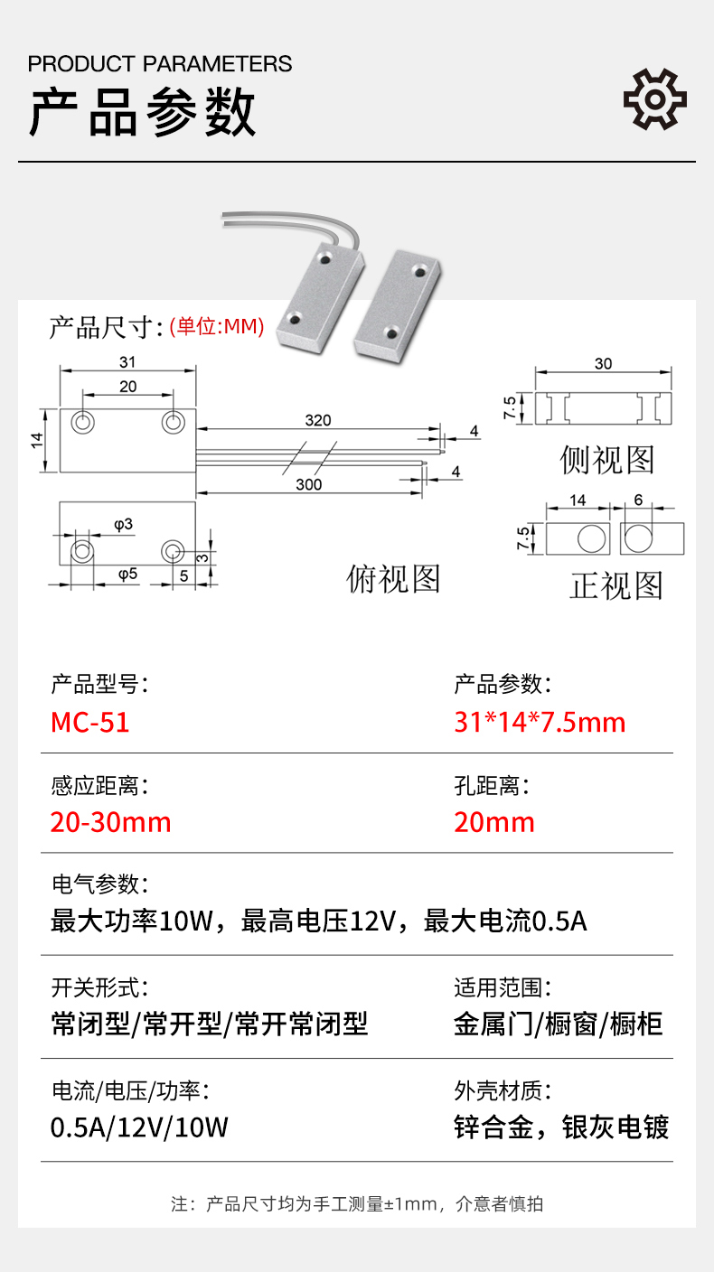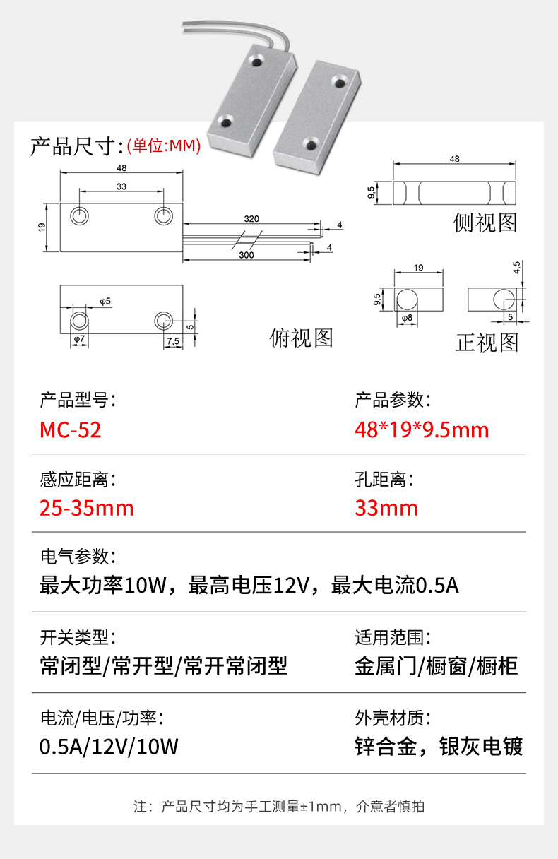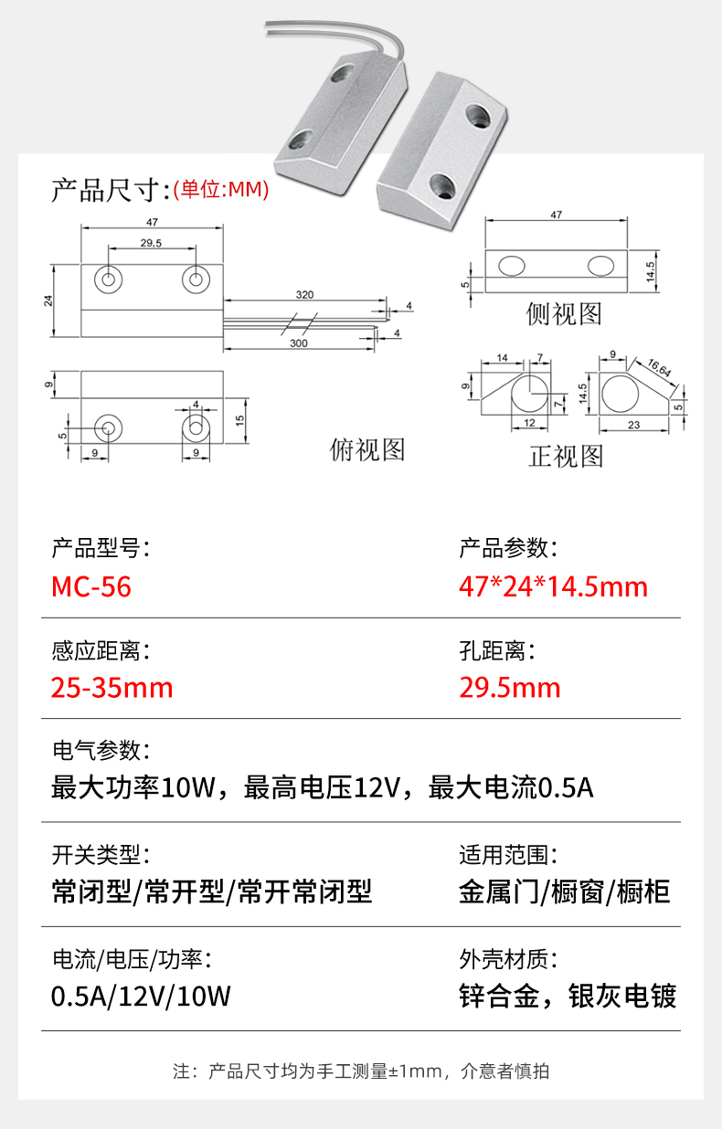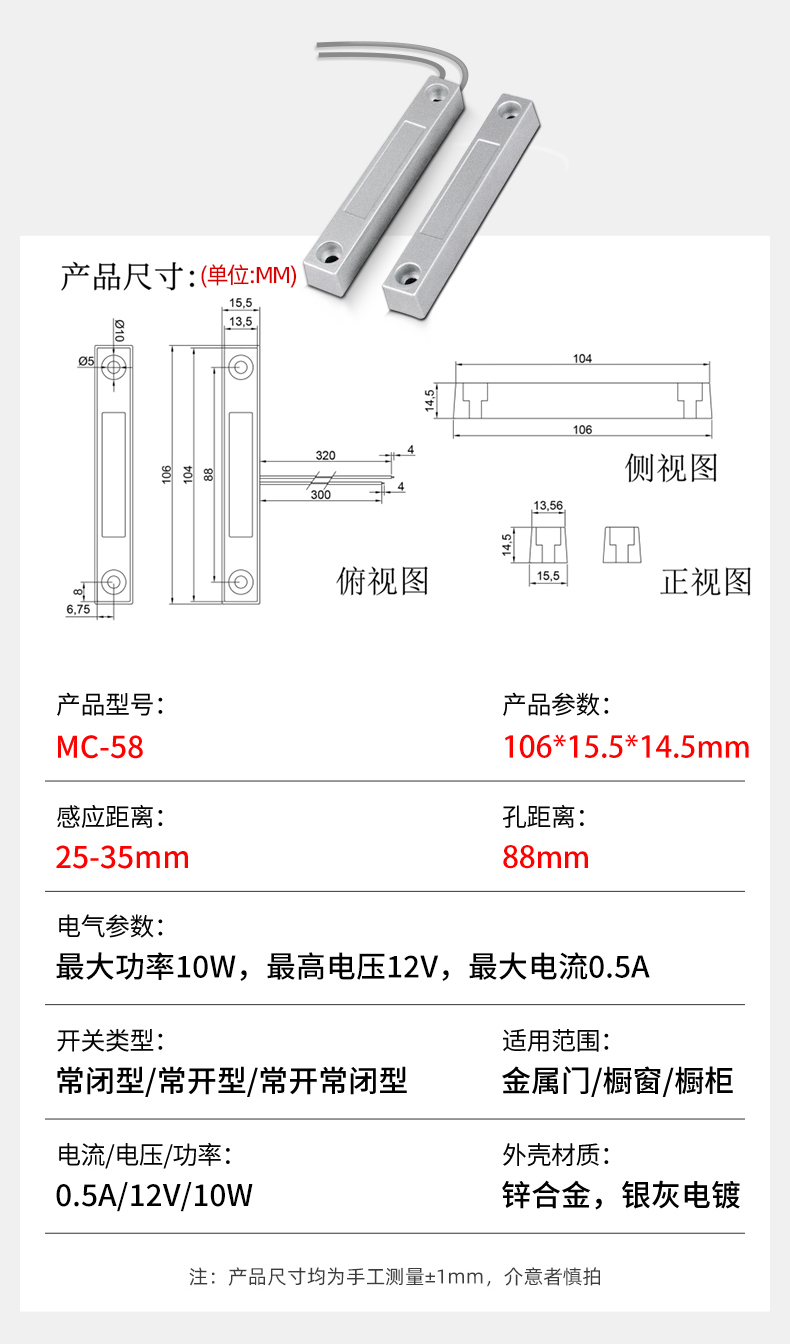 | Цветовые варианты | ---[Нормально замкнутый] Пассивный переключатель, сухой контакт---, MC-51 [НЗ] сигнал при замыкании, MC-52 [НЗ] сигнал при замыкании, MC-56 [НЗ] сигнал при замыкании, MC-58 [НЗ] сигнал при замыкании, MC-59 [НЗ] сигнал при замыкании, Магнит с двойной дверью [НЗ] сигнал при замыкании, ---[Нормально разомкнутый] Пассивный переключатель, сухой контакт---, MC-51 [НО] сигнал при размыкании, MC-52 [НО] сигнал при размыкании, MC-56 [НО] сигнал при размыкании, MC-58 [НО] сигнал при размыкании, MC-59 [НО] сигнал при размыкании, Магнит с двойной дверью [НО] сигнал при размыкании, [НО и НЗ] Трехпроводной пассивный переключатель, сухой контакт, MC-51 [НО и НЗ] сигнал выбирается, MC-52 [НО и НЗ] сигнал выбирается, MC-56 [НО и НЗ] сигнал выбирается, MC-58 [НО и НЗ] сигнал выбирается, MC-59 [НО и НЗ] сигнал выбирается, Магнит с двойной дверью [НО и НЗ] сигнал выбирается, ---Постоянный-ток и переменный-ток [магнит с нагрузкой] с питанием---, MC-52 [Разомкнут с питанием] 12В-24В, MC-52 [Разомкнут с питанием] 110В-230В |