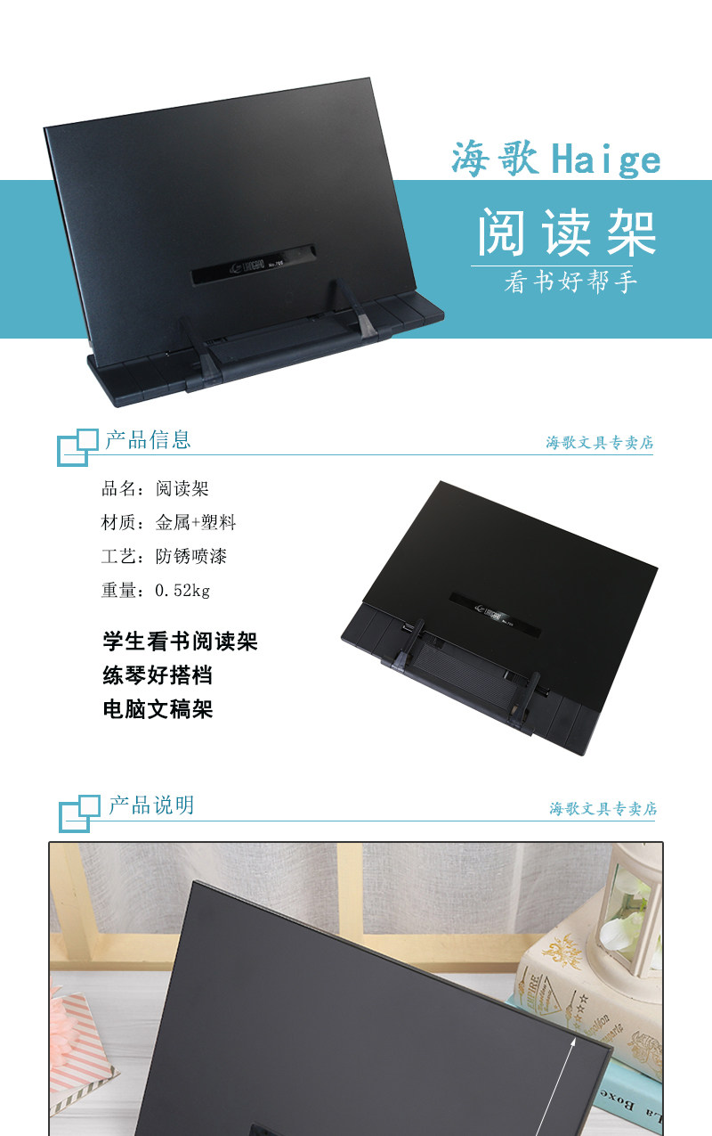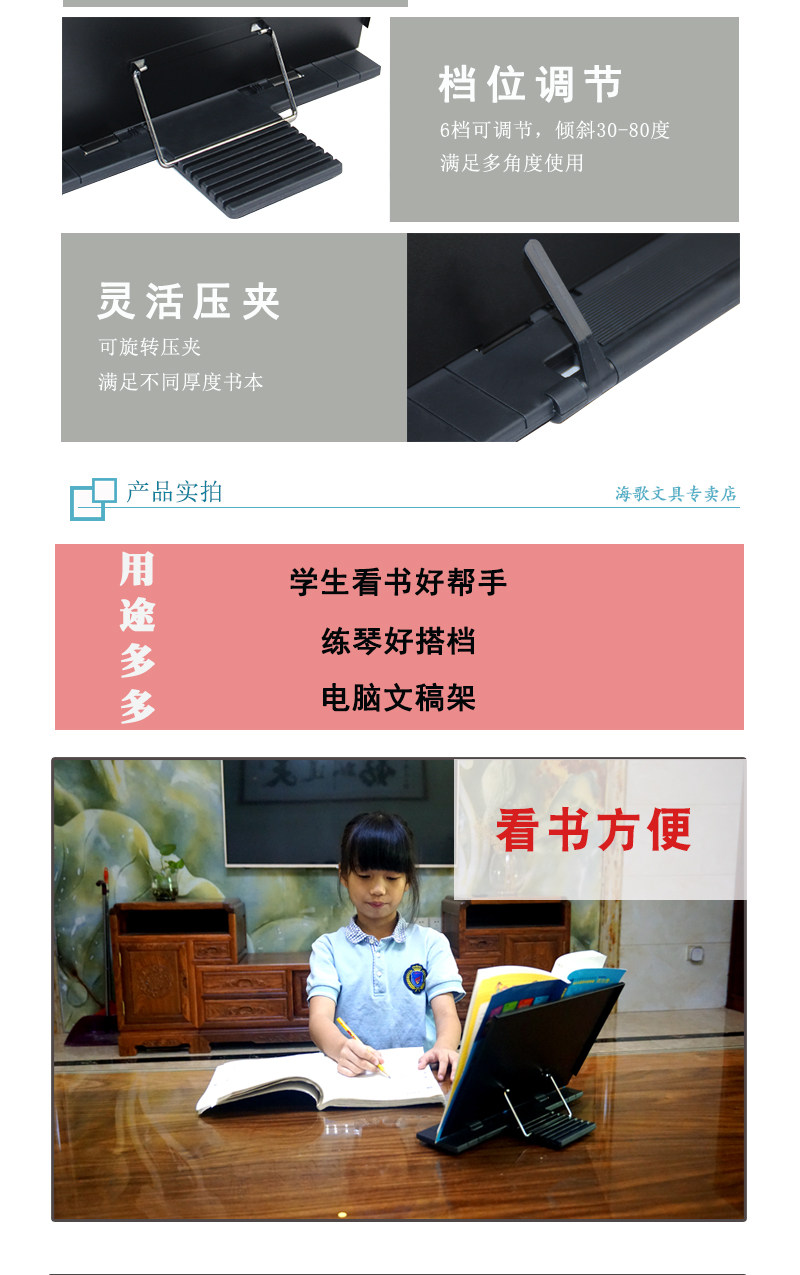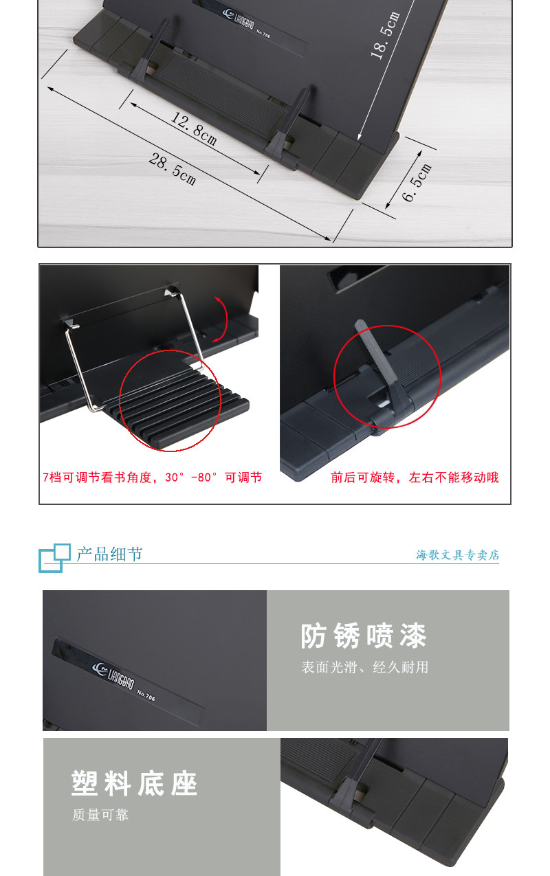 喷漆防锈的铁质读书架.经久耐用,不像塑料一摔就碎.是办公学习的好帮手.更是孩子写字的好帮手.能有效的校正孩子的不良写字姿势.从而能有效的预防孩子的近视.保护好孩子视力,设计合理,轻松阅读,解放双手,大书厚书都可以搞定,书架还设有6档可调节架书倾斜度!金属板面加塑料底坐,质量可靠,用于阅读、乐谱、字帖、诵经...