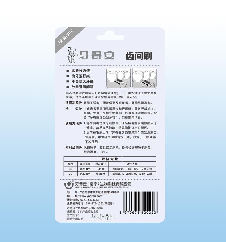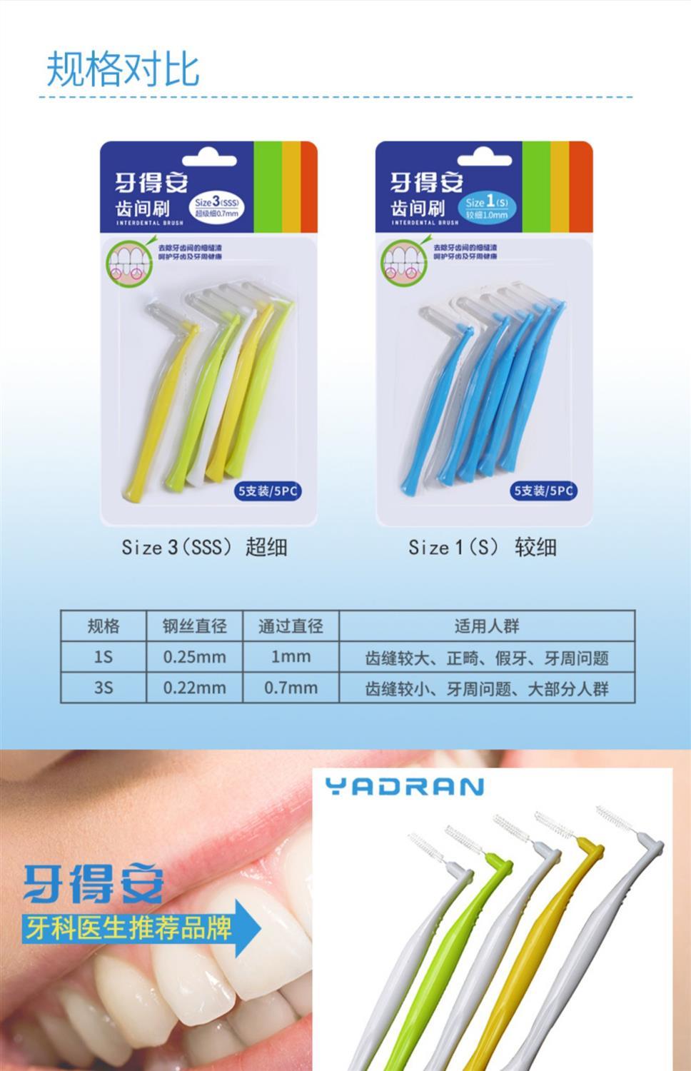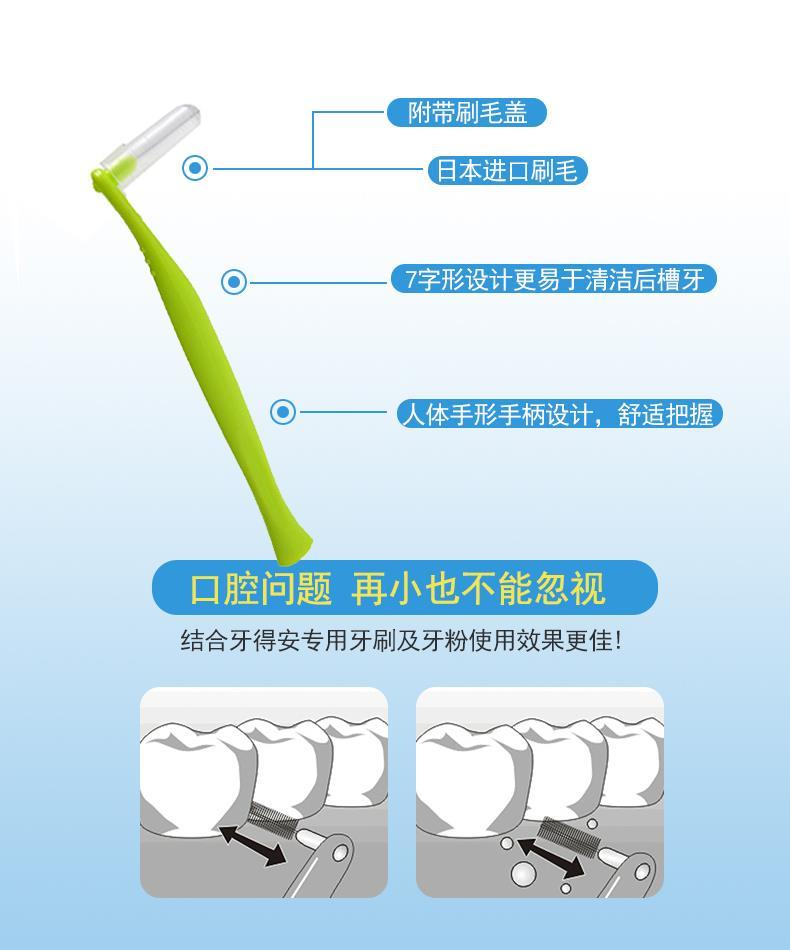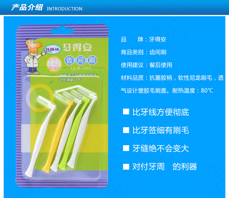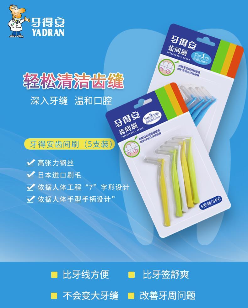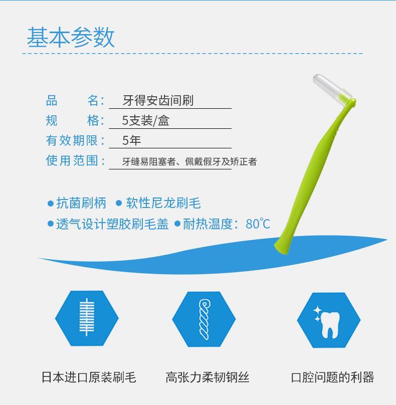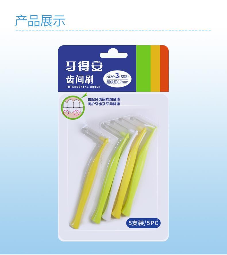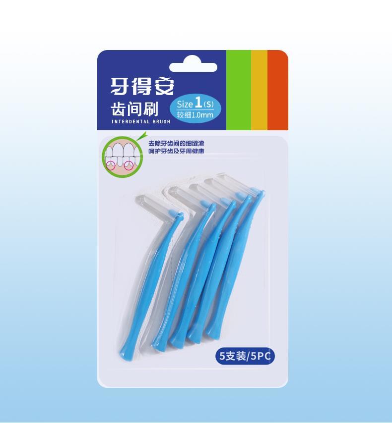 牙得安弯柄5支装牙缝刷、齿间刷是牙刷的辅助工具,牙刷刷不到的地方,需要齿间刷来帮助,彻底完成刷牙的整个过程。