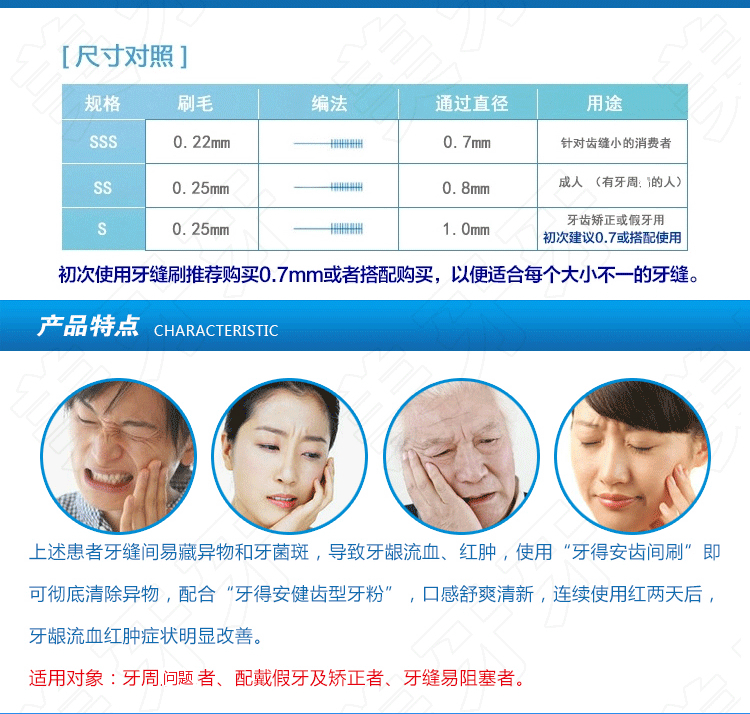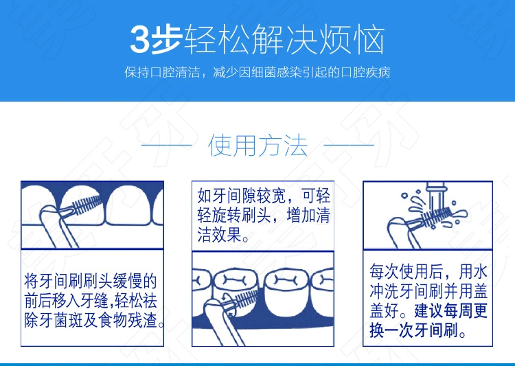 2、特别适合于正畸患者,牙周问题者,后牙区安装假牙患者及牙间距较宽者,可替代牙线棒,是必须性的第二把牙刷。
