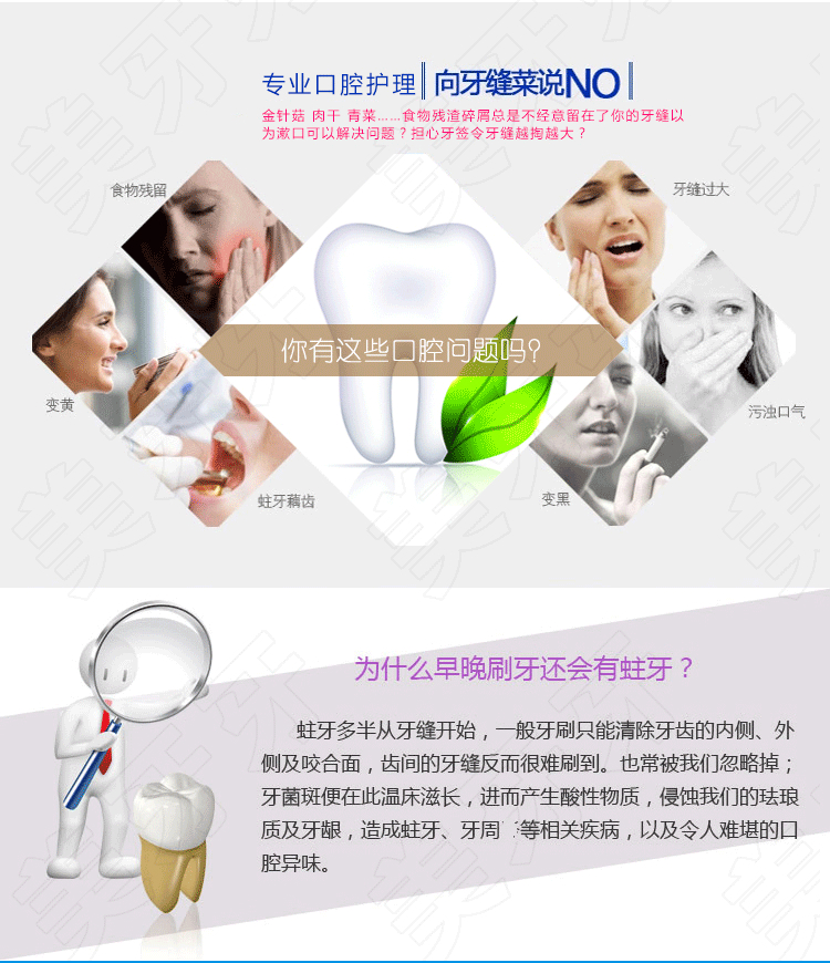 1、牙周问题者配带假牙及矫正者牙缝易阻塞者后牙