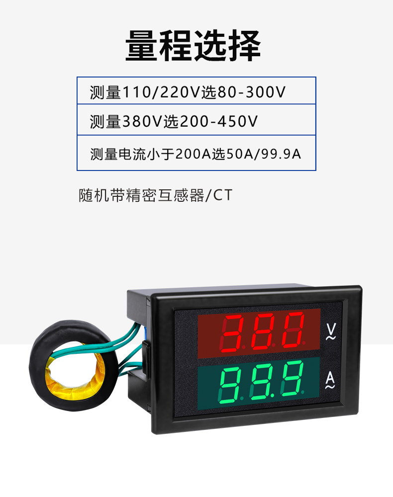 测量110V 220V电压请勾选AC80-300V,测量380V电压勾选200-450V的!测量电流在0.1-100A以内勾选固定式CT 0-50A或者勾选分体式CT 0-99.9A【测量精度不变】测量100A以上勾选199A【1.0A-199A测量精度不变】