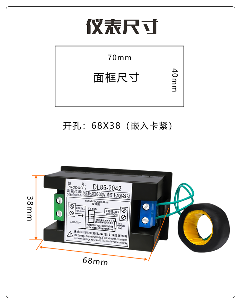 6.开孔按装尺寸:68*38mm(嵌入式按装)