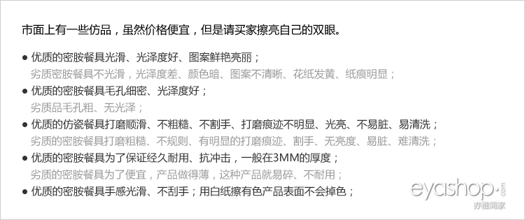 | 材质 | 纯密胺——更持久耐用,保用10年 | 脲醛树脂+表面密胺 |