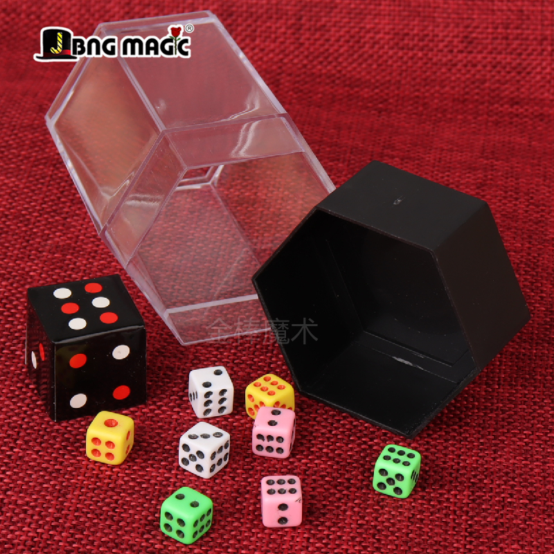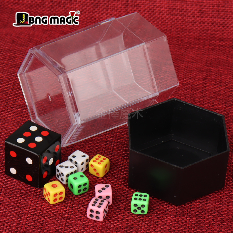 魔术效果:将一颗大骰子放入透明盒子里,盖上盖子,然后摇一下,瞬间变成八颗小骰子。
