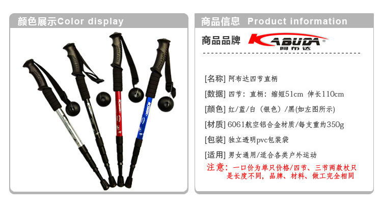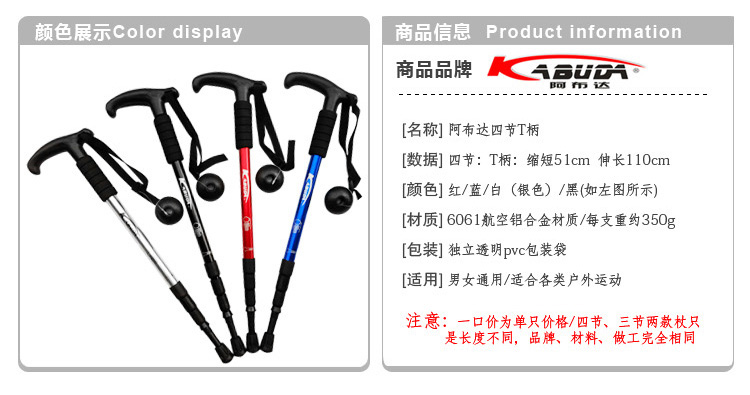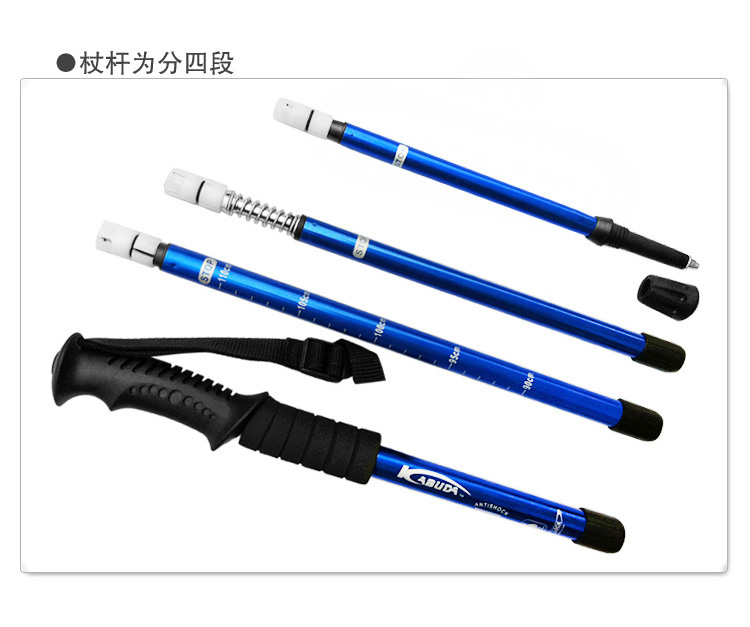 杖杆分四节,中间杖杆带有刻度,可以进行测量,最长可拉到1.1米,最短可缩至0.5米;T型硬塑手柄和特制海绵的把手,十分舒适;弹簧避震设计,可以减轻手腕、手臂和肩膀的冲击力;是登山、徒步、旅游等户外活动的必备工具。