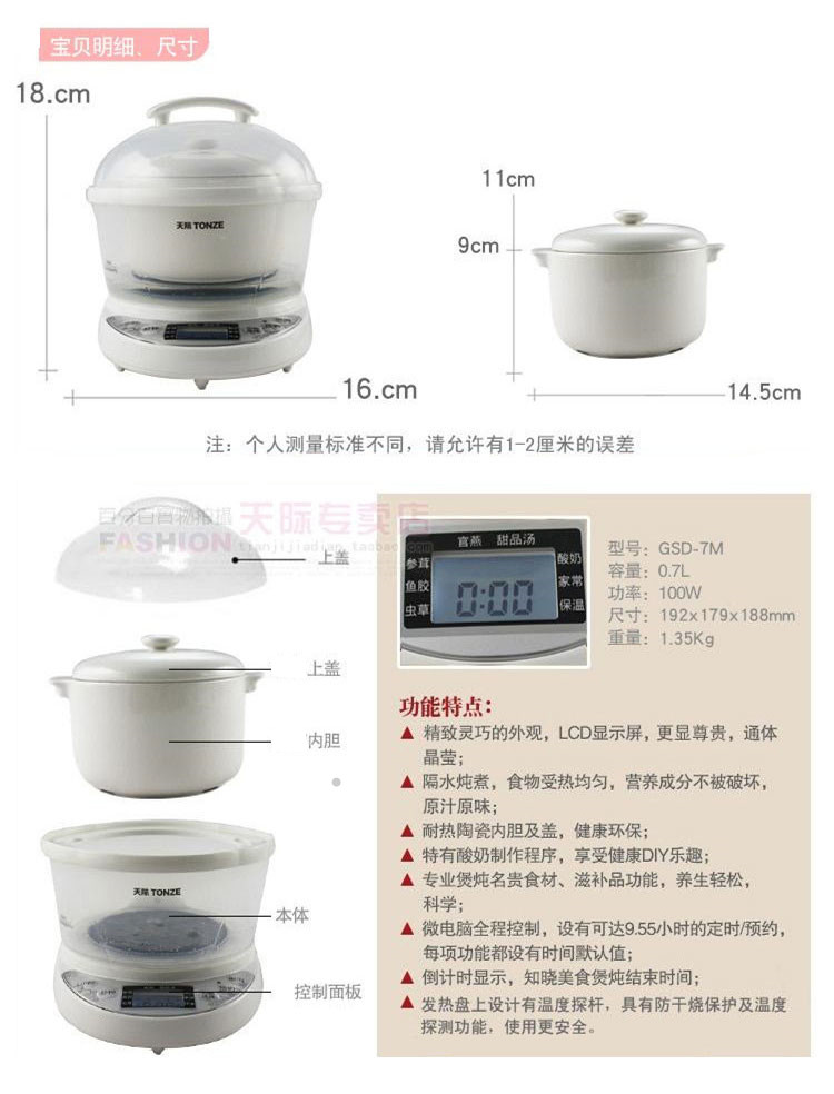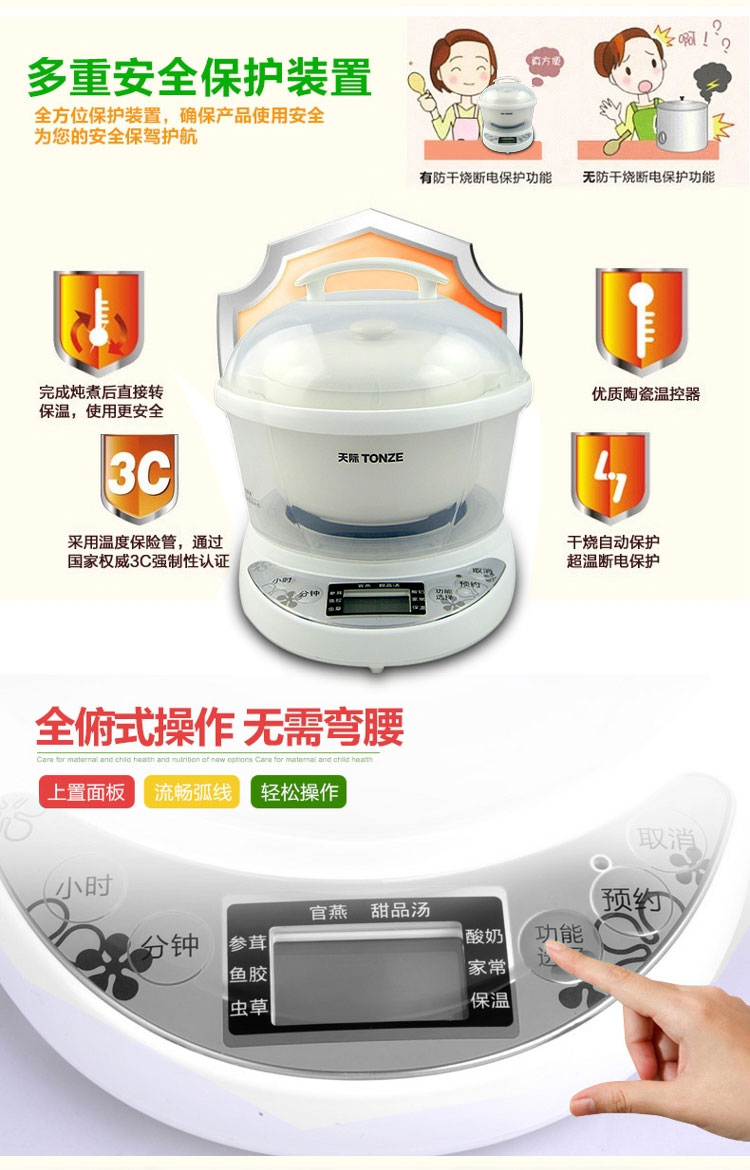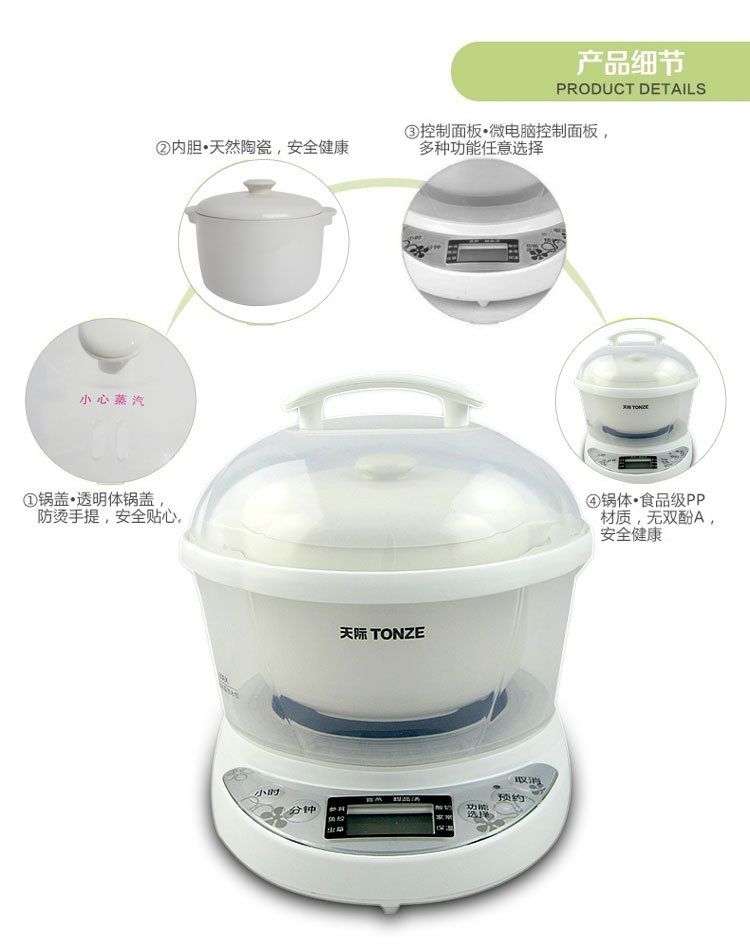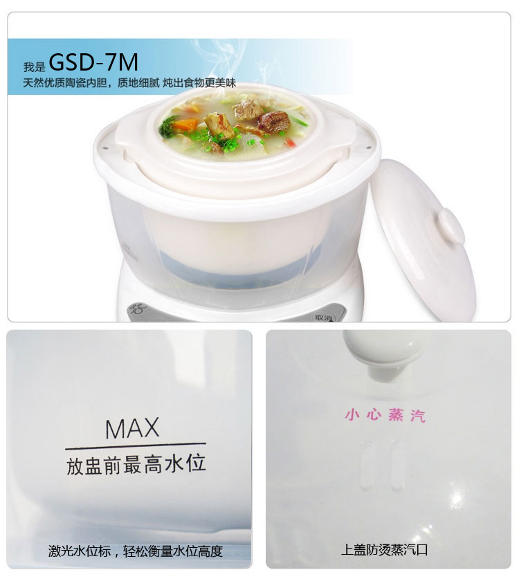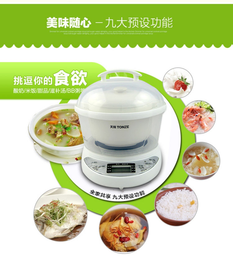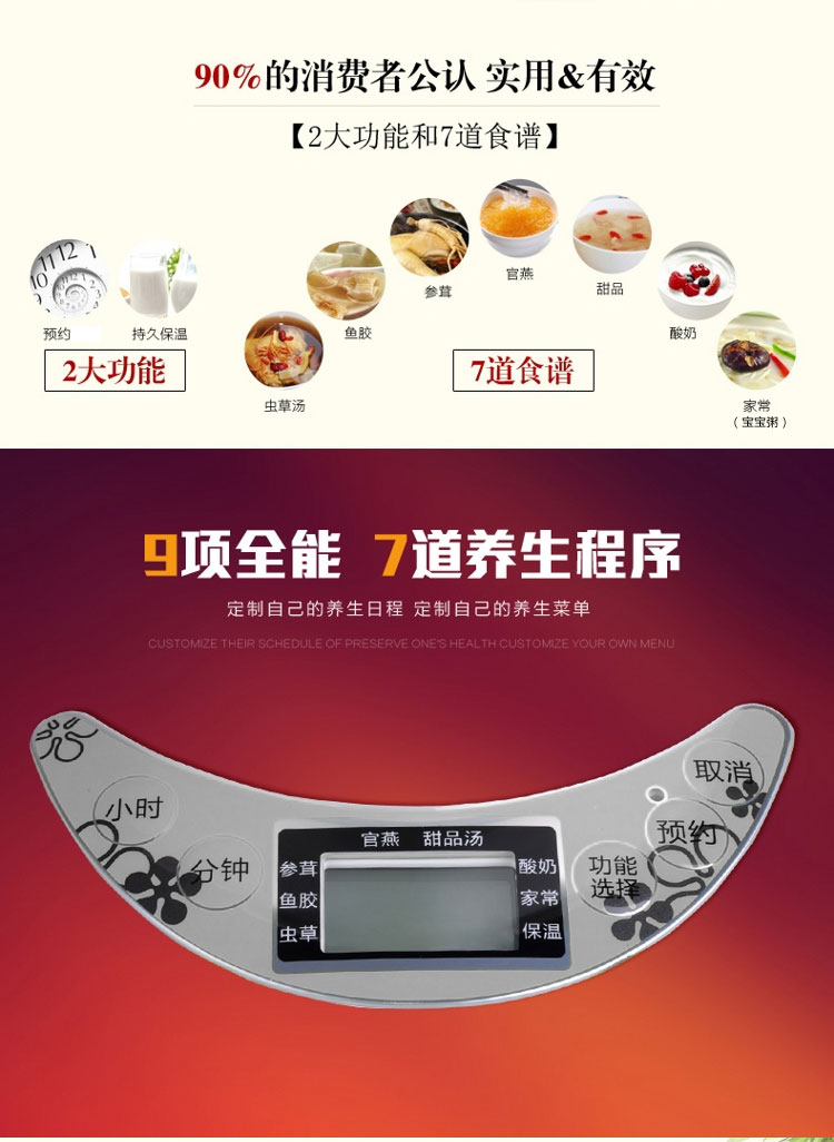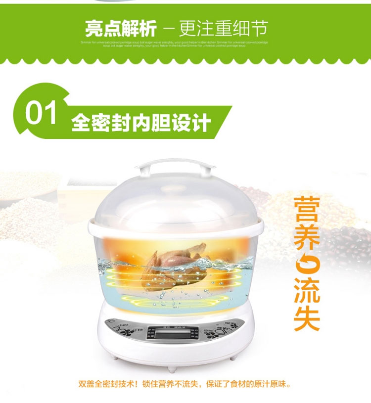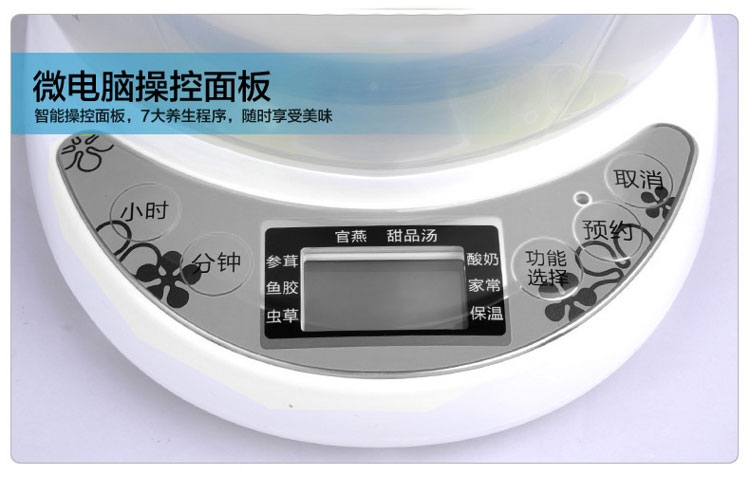 | Функции меню | Гнездо ласточки, паровой яичный пудинг, тушёные десерты, варка простой каши, детское питание, каши из различных злаков, питательные супы, тушёный рыбный пузырь |