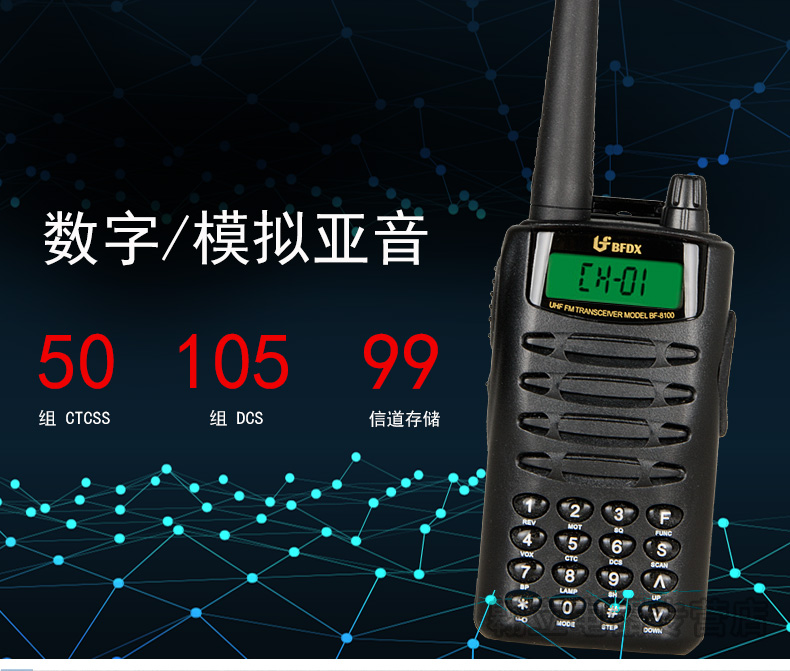 具有38组标准模拟亚音频和83组标准数字亚音代码,支持非标准CTCSS/CDCSS,设置CTCSS或CDCSS后,可以消除同频所带来的干扰,还可以消除发送方由于通话结束、载波引起的“咔嚓”声。