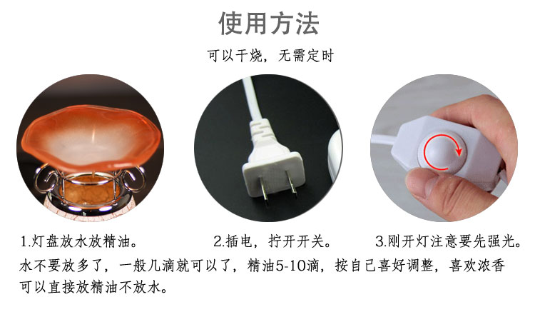 1.加水到上方的托盘或杯状容器,一点点就可以,没过盘底,滴入5-10滴香薰精油于容器内,强光约30分钟左右,香气即开始散布空气中,清新持久,喜欢浓香也可以不放水直接放精油;