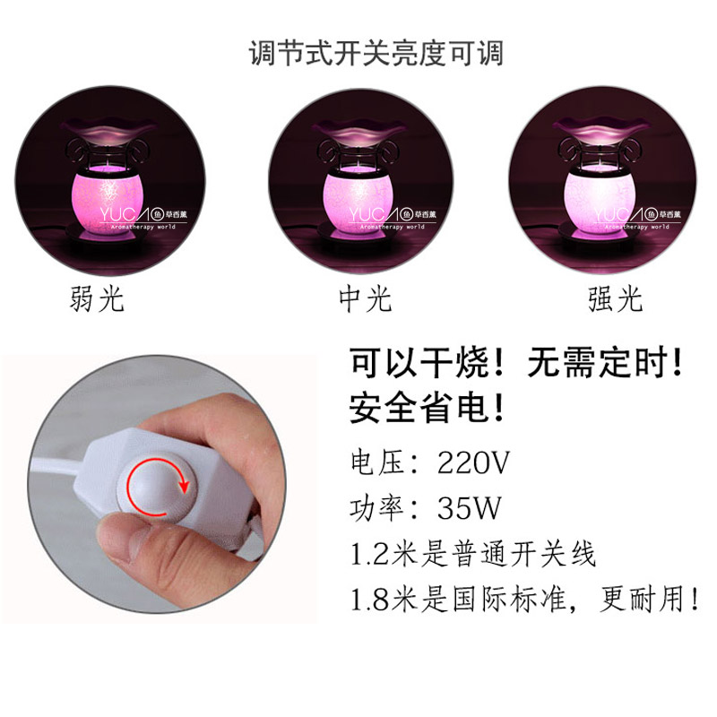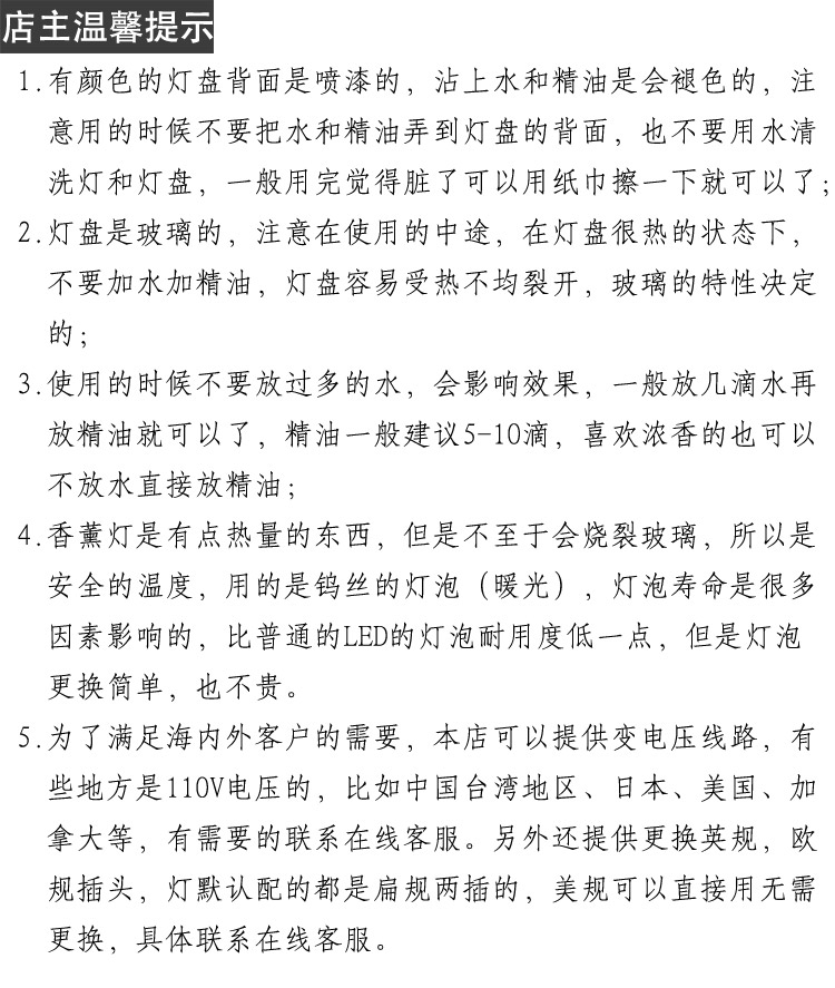温馨提示:使用的时候注意,灯盘子的背面是喷漆的,用的时候要注意不要把精油和水弄到盘子的背面了,也不要清洁灯罩的内壁(那部分是线路部分不能沾水的)