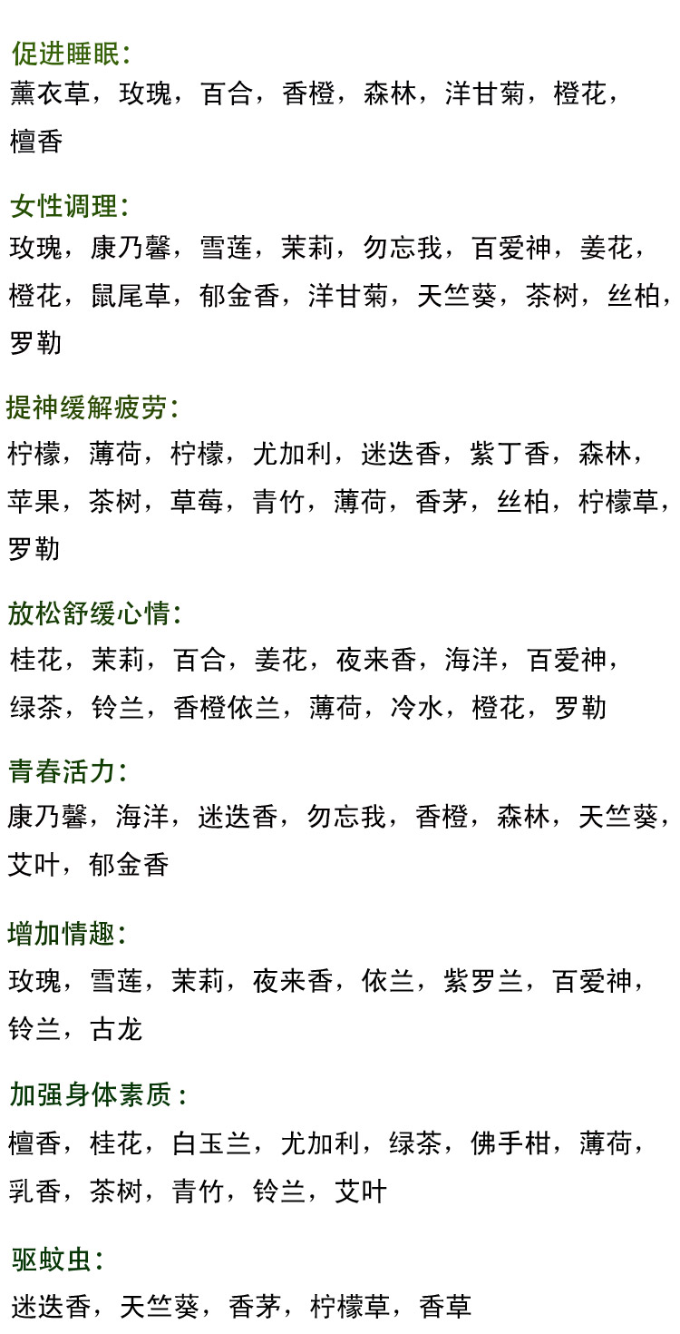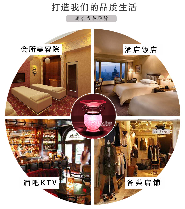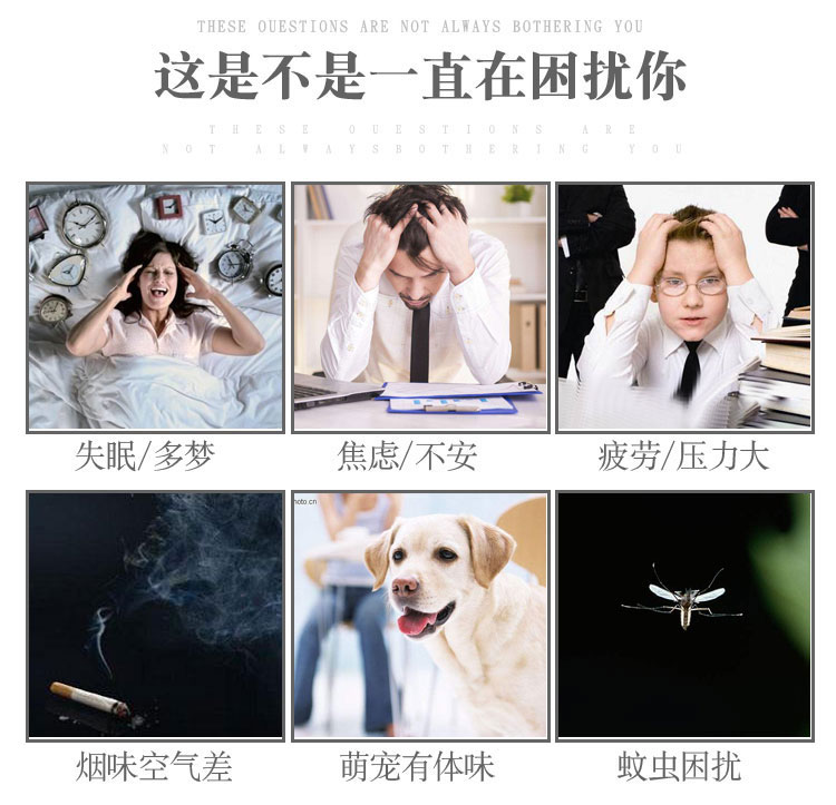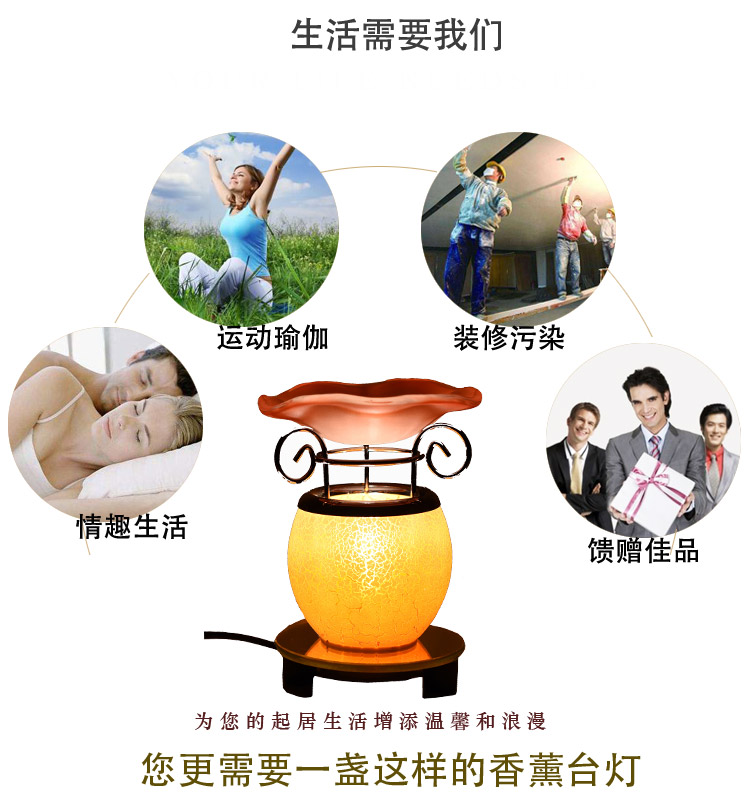 精油透过香薰灯加热分解,使精油中阴离子芬多精飘散于空气中,从而净化空气,芳香环境,舒缓心情,调理情绪。