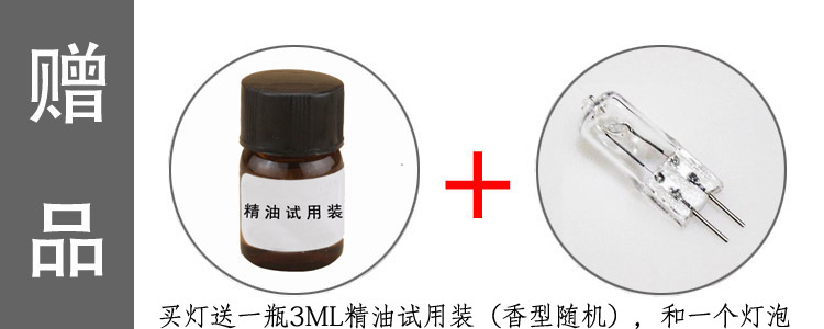 特别提示:买灯赠的精油是3ml,因为3ml精油香型本身就不全,发货量大的原因,不确定哪一种香型在发货的时候有,为了避免不愉快和不耽误发货,赠品香型都是随机发的谢谢理解,不接受因为赠品而给的中差评,介意的勿拍。