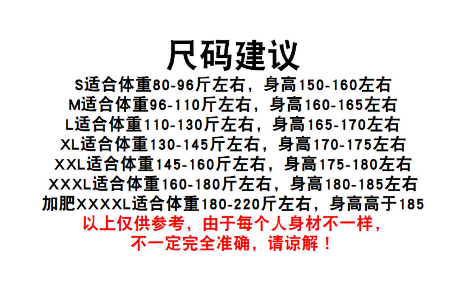 | 尺码 | 儿童110码(适合儿童身高108以下),儿童120码(适合身高118以下),儿童130码(适合身高128以下),儿童140码(适合身高138以下),儿童150码(适合身高148以下),S(身高150-158体重90斤左右),M(身高158-163体重105斤左右),L(身高163-168体重125斤左右),XL(身高168-173体重140斤左右),XXL(身173-178体重155斤左右),XXXL(身178-185体重170斤左右),4XL(胸围132以内体重200斤) |