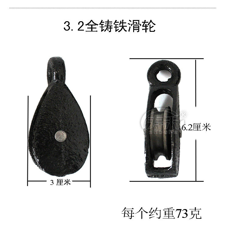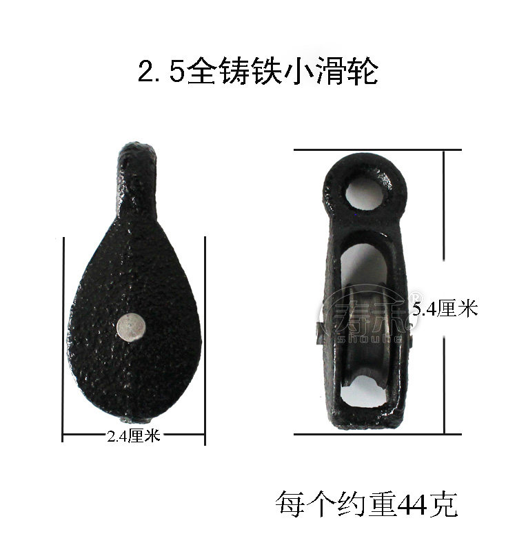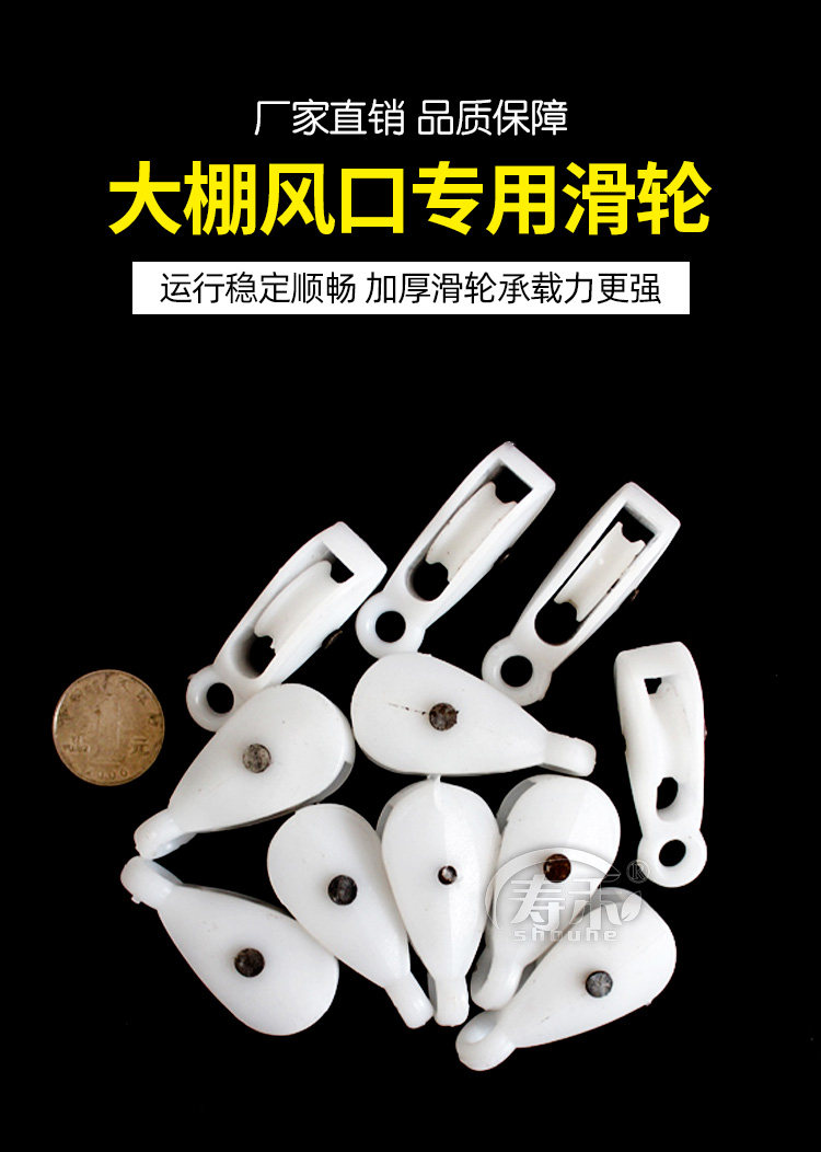 铸铁外壳,塑料内轮,质量好,耐用,温室放风口的滑轮。