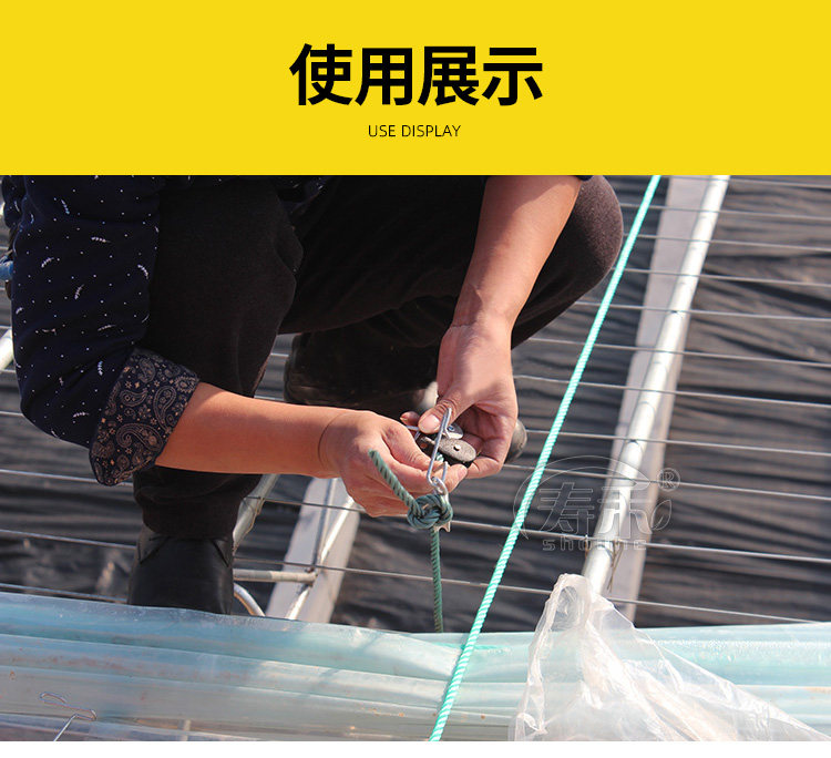 冬春季节刮风天气较多,常见北风或西北风,温室拉开放风口后,除了靠近拉绳处的放风膜不易被吹动外(因为放风绳固定在了后立柱上),其它位置的放风膜边缘易被吹动,这样便会减小放风口,甚至关闭放风口,导致放风效果不佳。解决这个问题的办法就是不时地检查一下,若发现风口关闭了,便重新拉开,继续放风。这样做费工费时,使用放风保险绳,就能克服此弊端。