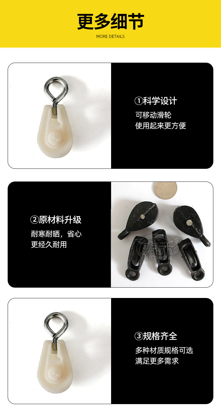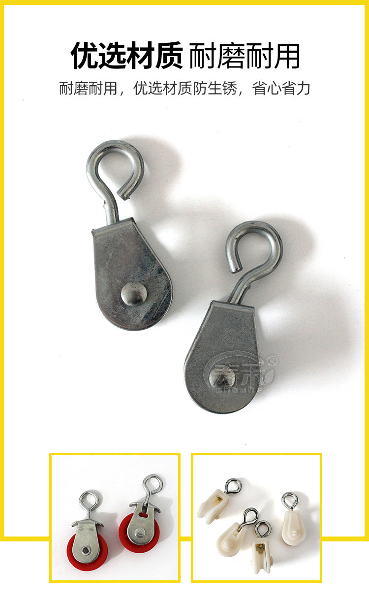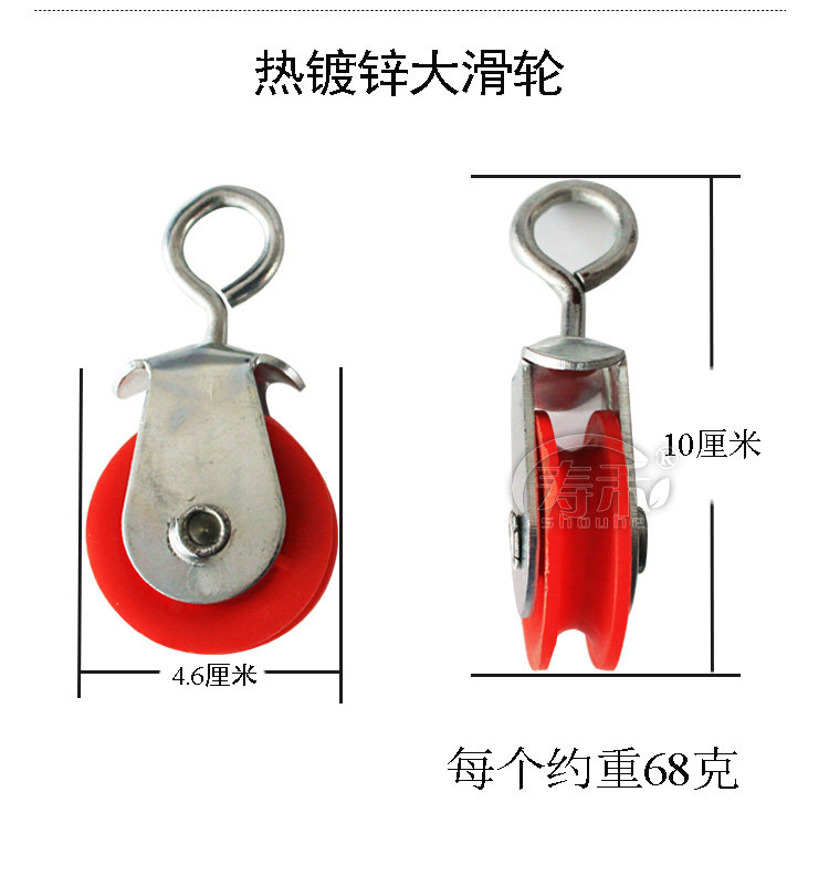 | 颜色分类 | 2.5普通塑料滑轮,2.5尼龙滑轮,2.5铸铁壳塑料轮黑白轮随机发,2.5全铸铁滑轮,2.5热镀锌滑轮(侧钩),2.5热镀锌滑轮(直钩),2.5移动ABS滑轮(侧钩),3.2尼龙滑轮,3.2铸铁壳塑料轮滑轮,3.2全铸铁滑轮两种颜色随机发,3.2移动ABS滑轮(侧钩),4.5热镀锌大滑轮(红色),4.5热镀锌大滑轮(加强版)黄色 |