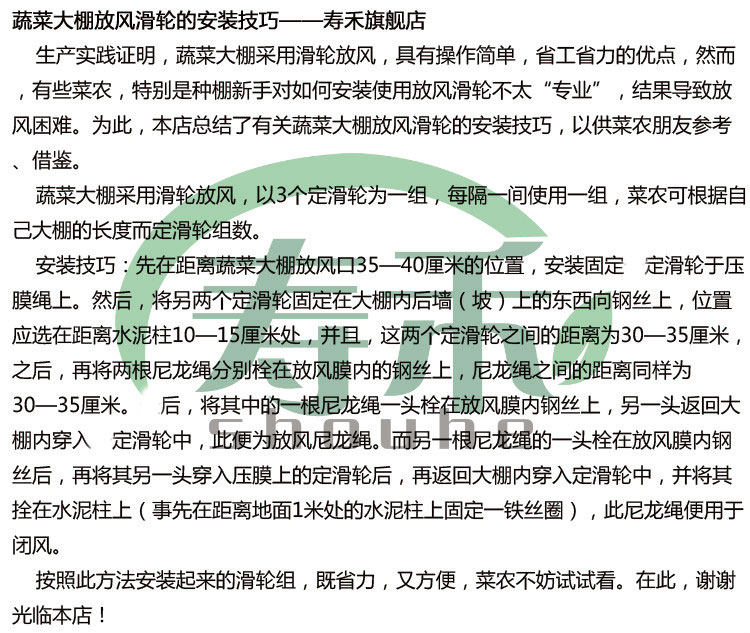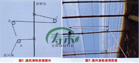 过去,覆盖日光温室的棚膜为一个整体,一天须多次爬到温室屋顶上去扒缝放风,这种放风方式既增加了劳动强度,又不安全。而通风滑轮的应用是在1个日光温室上覆盖大、小两块棚膜,在温室内部就能通过滑轮和绳索调节通风口的大小,既节约时间,又安全又省事。通风滑轮通常以3个定滑轮为一组,每隔一间使用一组,依据温室长度确定滑轮组数。