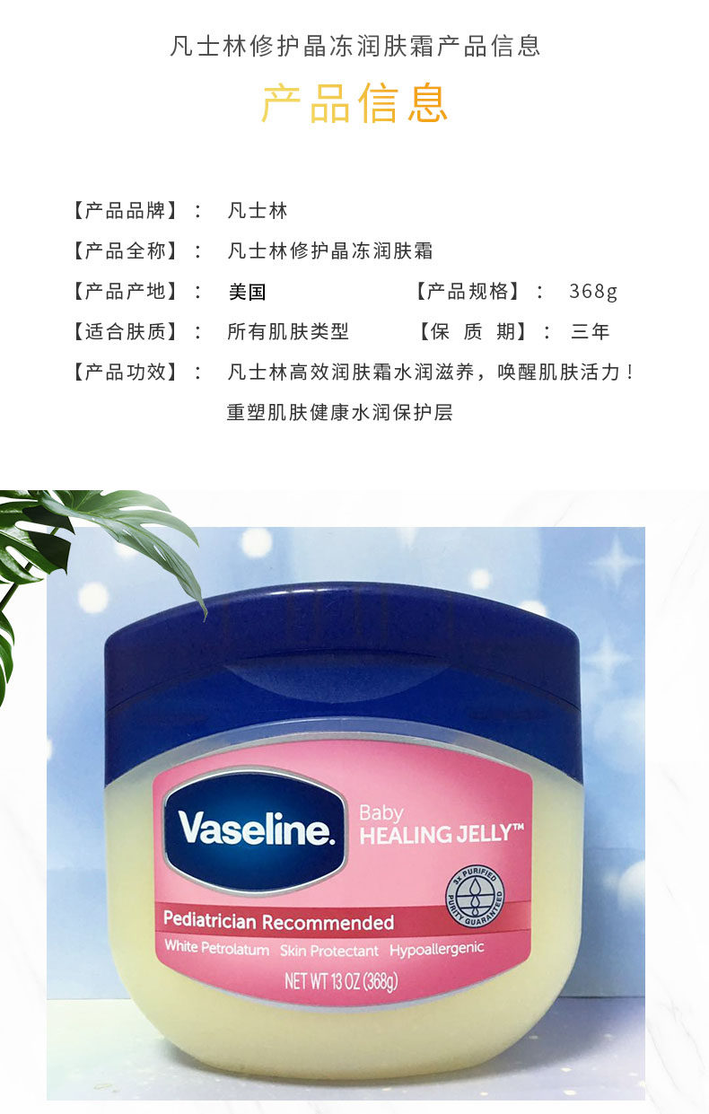 | 香味 | 美版婴儿凡368克,美版蓝色原味368克,蓝色原味106克 |