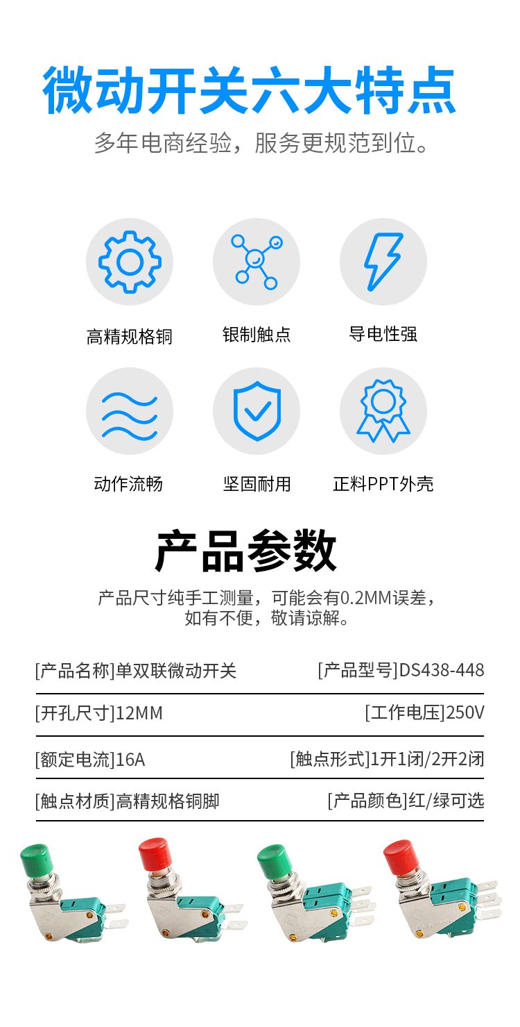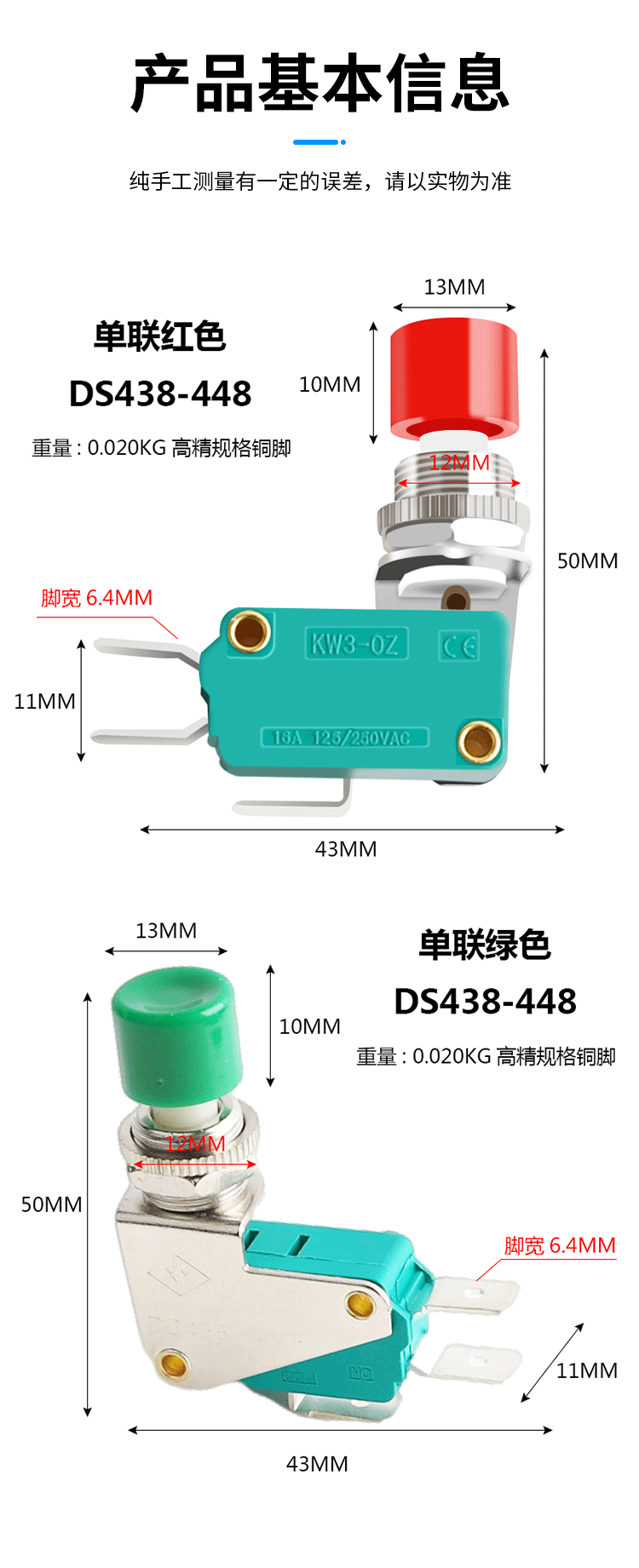 按钮微动开关DS438-448限位开关DS-438双联红色绿KW3-0Z行程开关