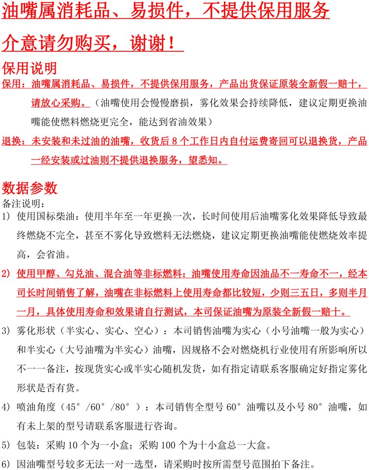 | 颜色分类 | 0.4#60°,0.5#60°,0.60#60°,0.65#60°,0.75#60°,0.85#60°,1.00#60°,1.25#60°,1.35#60°,1.50#60°,1.65#60°,1.75#60°,2.00#60°,2.25#60°,2.50#60°,2.75#60°,3.00#60°,3.50#60°,3.75#60°,4.00#60°,4.50#60°,5.00#60°,5.50#60°,6.00#60°,6.50#60°,7.00#60°,7.50#60°,8.00#60°,8.50#60°,9.00#60°,10.0#60°,11.0#60°,12.0#60°,13.0#60°,13.5#60°,15.0#60°,17.0#60°,19.5#60°,22.0#60°,25.0#60°,28.0#60°,31.5#60°,1.00#80°,1.25#80°,1.50#80°,2.0#80°,2.50#80°,其它油嘴型号请联系客服 |