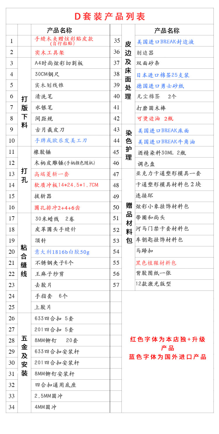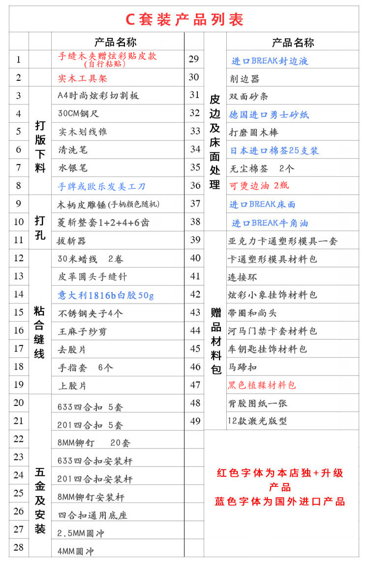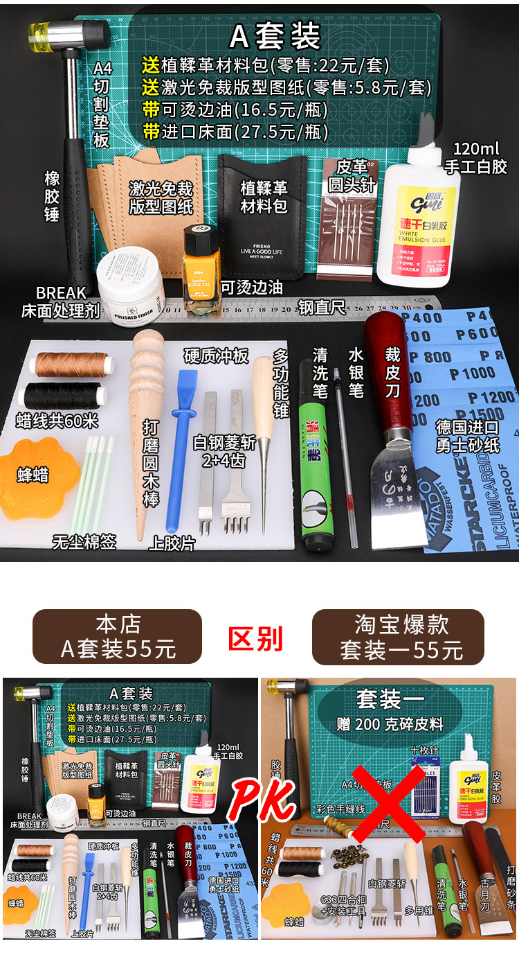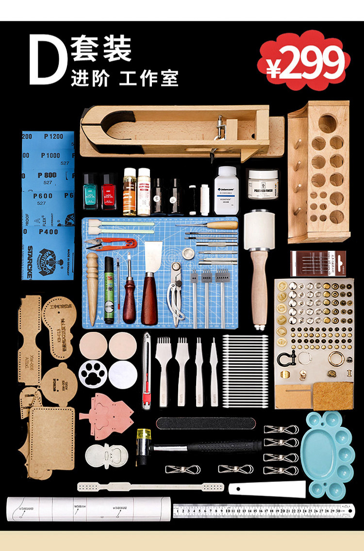 A套装21件含(可烫边油+进口床面),B套装28件含(手缝木夹+可烫边油+进口化料),C套装49件含(手缝木夹+可烫边油+进口1816B),D套装58件含(手缝木夹+可烫边油+进口化料),A套装+实木工具架,A套装+红榉手缝木夹,B套装+实木工具架,新手体验套装
