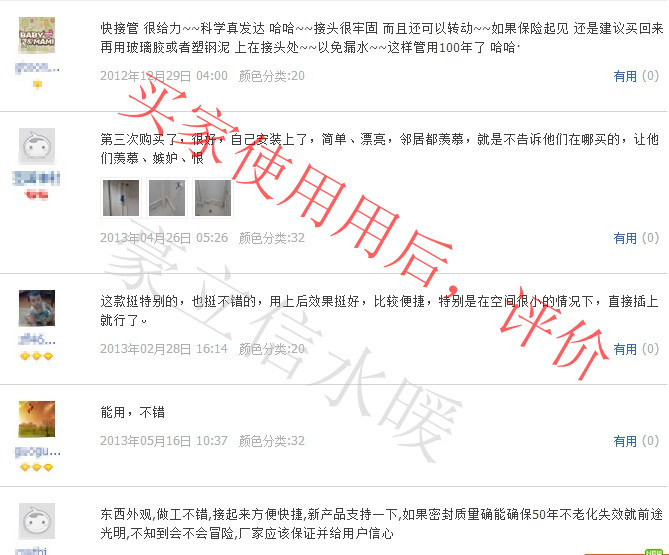 店主:肯定是比普通的PPR管件要贵。我们这个产品主要原材料是采用美国杜邦进口的POM,POM中文名叫聚甲醛,又称赛钢、特钢,类似于金属的强度和硬度。它具有防冻、抗压耐磨、耐高温和抗紫外线等物理特性,原材料的价格是PPR的两倍,我们两个316不锈钢卡环就要1块钱左右,够买一个便宜的PPR接头,我们这4个密封圈要1.5元左右。因为我们是最早研发者,就要用最好的零配件,如果我们一开始只图便宜,用普通材料做,那岂不是拿石头砸自己的脚,否则也不叫什么新产品。你说对不对?具体价格你可以看一下我们的价格表,其实算起来我们的管件跟日丰,伟星,金德,金牛等管件价格相差不大,但我们管件安装更便利,无需专业人员维修。讲究的是劳动效率,国家也是大力提倡转型升级嘛?同时也符合国家产业政策。