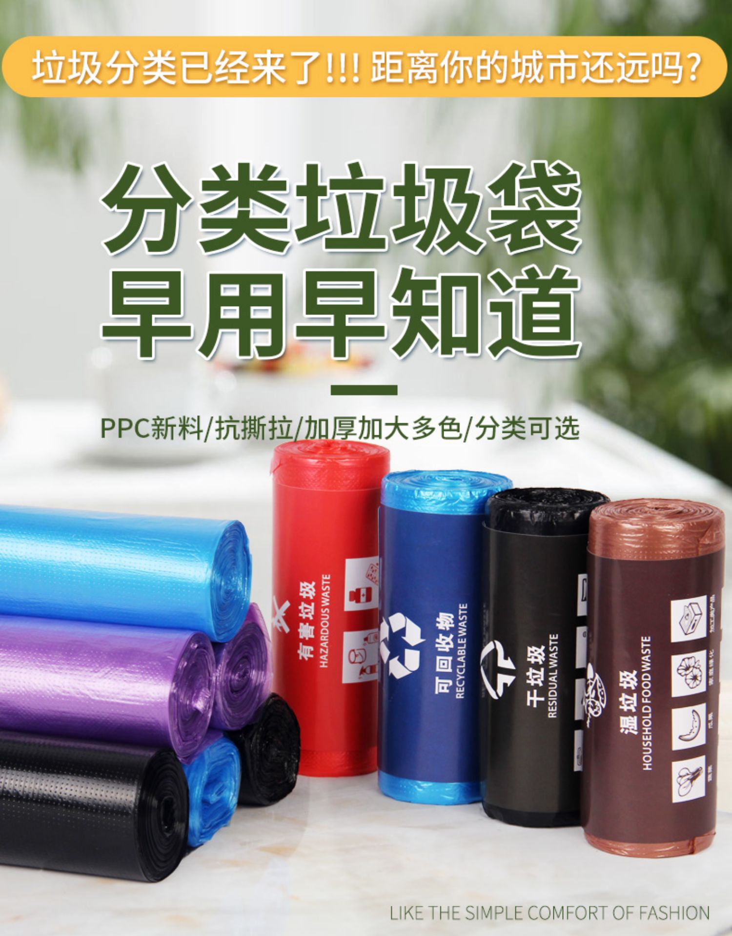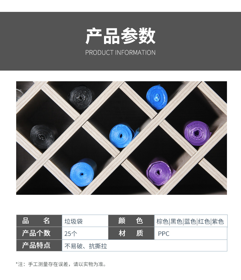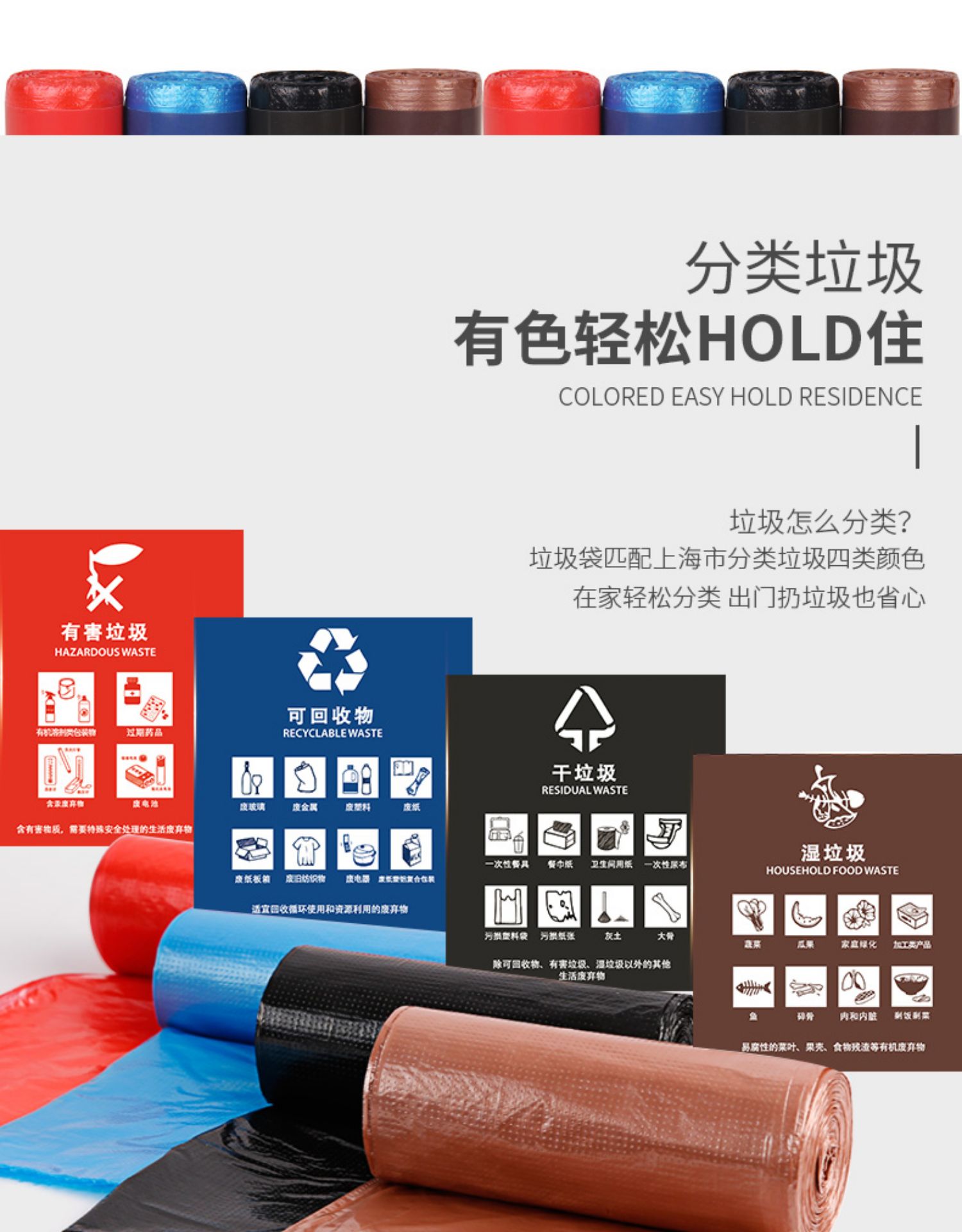 | 颜色分类 | 黑色45*55【一卷25个】,蓝色45*55【一卷25个】,紫色45*55【一卷25个】,黑色50*60【一卷25个】,蓝色50*60【一卷25个】,紫色50*60【一卷25个】,【干垃圾】50*60一卷25个,【湿垃圾】50*60一卷25个,【有毒垃圾】50*60一卷25个,【可回收垃圾】50*60一卷25个 |