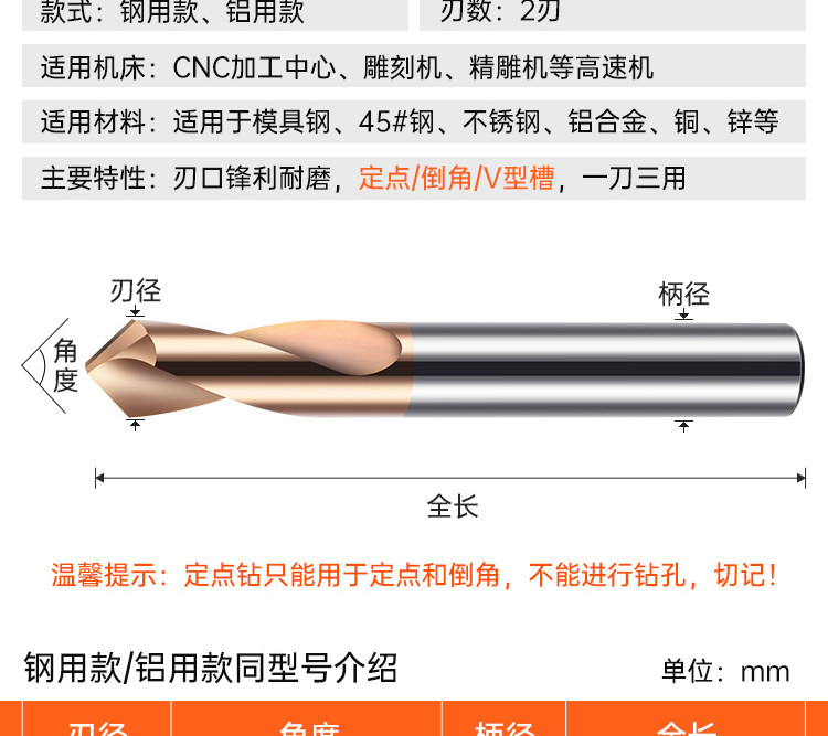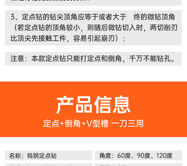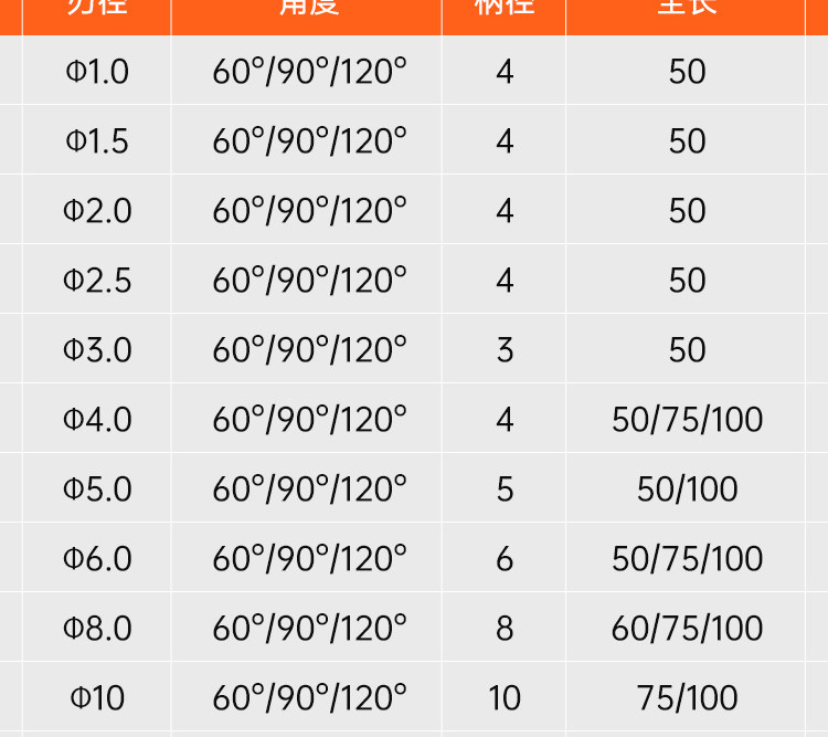 | 颜色分类 | 【90度】铝用1.0mmx50L-2刃,【90度】铝用1.5mmx50L-2刃,【90度】铝用2.0mmx50L-2刃,【90度】铝用2.5mmx50L-2刃,【90度】铝用3.0mmx50L-2刃,【90度】铝用4.0mmx50L-2刃,【90度】铝用5.0mmx50L-2刃,【90度】铝用6.0mmx50L-2刃,【90度】铝用8.0mmx60L-2刃,【90度】铝用10.0mmx75L-2刃,【90度】铝用12.0mmx75L-2刃,【90度】铝用16.0mmx100L-2刃,【90度】铝用4.0mmx75L-2刃,【90度】铝用4.0mmx100L-2刃,【90度】铝用5.0x100L-2刃,【90度】铝用6.0mmx75L-2刃,【90度】铝用6.0mmx100L-2刃,【90度】铝用8.0mmx75L-2刃,【90度】铝用8.0x100L-2刃,【90度】铝用10.0x100L-2刃,【90度】铝用12.0x100L-2刃,【90度】钢用1.0mmx50L-2刃,【90度】钢用1.5mmx50L-2刃,【90度】钢用2.0mmx50L-2刃,【90度】钢用2.5mmx50L-2刃,【90度】钢用3.0mmx50L-2刃,【90度】钢用4.0mmx50L-2刃,【90度】钢用5.0mmx50L-2刃,【90度】钢用6.0mmx50L-2刃,【90度】钢用8.0mmx60L-2刃,【90度】钢用10.0mmx75L-2刃,【90度】钢用12.0mmx75L-2刃,【90度】钢用4.0mmx75L-2刃,【90度】钢用4.0mmx100L-2刃,【90度】钢用5.0mmx100L-2刃,【90度】钢用6.0mmx75L-2刃,【90度】钢用6.0mmx100L-2刃,【90度】钢用8.0mmx75L-2刃,【90度】钢用8.0mmx100L-2刃,【90度】钢用10.0mmx100L-2刃,【90度】钢用12.0mmx100L-2刃,【60度】铝用1.0mmx50L-2刃,【60度】铝用1.5mmx50L-2刃,【60度】铝用2.0mmx50L-2刃,【60度】铝用2.5mmx50L-2刃,【60度】铝用3.0mmx50L-2刃,【60度】铝用4.0mmx50L-2刃,【60度】铝用5.0mmx50L-2刃,【60度】铝用6.0mmx50L-2刃,【60度】铝用8.0mmx60L-2刃,【60度】铝用10.0mmx75L-2刃,【60度】铝用12.0mmx75L-2刃,【60度】钢用1.0mmx50L-2刃,【60度】钢用1.5mmx50L-2刃,【60度】钢用2.0mmx50L-2刃,【60度】钢用2.5mmx50L-2刃,【60度】钢用3.0mmx50L-2刃,【60度】钢用4.0mmx50L-2刃,【60度】钢用5.0mmx50L-2刃,【60度】钢用6.0mmx50L-2刃,【60度】钢用8.0mmx60L-2刃,【60度】钢用10.0mmx75L-2刃,【60度】钢用12.0mmx75L-2刃,【120度】铝用1.0mmx50L-2刃,【120度】铝用1.5mmx50L-2刃,【120度】铝用2.0mmx50L-2刃,【120度】铝用2.5mmx50L-2刃,【120度】铝用3.0mmx50L-2刃,【120度】铝用4.0mmx50L-2刃,【120度】铝用5.0mmx50L-2刃,【120度】铝用6.0mmx50L-2刃,【120度】铝用8.0mmx60L-2刃,【120度】铝用10.0mmx75L-2刃,【120度】铝用12.0mmx75L-2刃,【120度】钢用1.0mmx50L-2刃,【120度】钢用1.5mmx50L-2刃,【120度】钢用2.0mmx50L-2刃,【120度】钢用2.5mmx50L-2刃,【120度】钢用3.0mmx50L-2刃,【120度】钢用4.0mmx50L-2刃,【120度】钢用5.0mmx50L-2刃,【120度】钢用6.0mmx50L-2刃,【120度】钢用8.0mmx60L-2刃,【120度】钢用10.0mmx75L-2刃,【120度】钢用12.0mmx75L-2刃 |