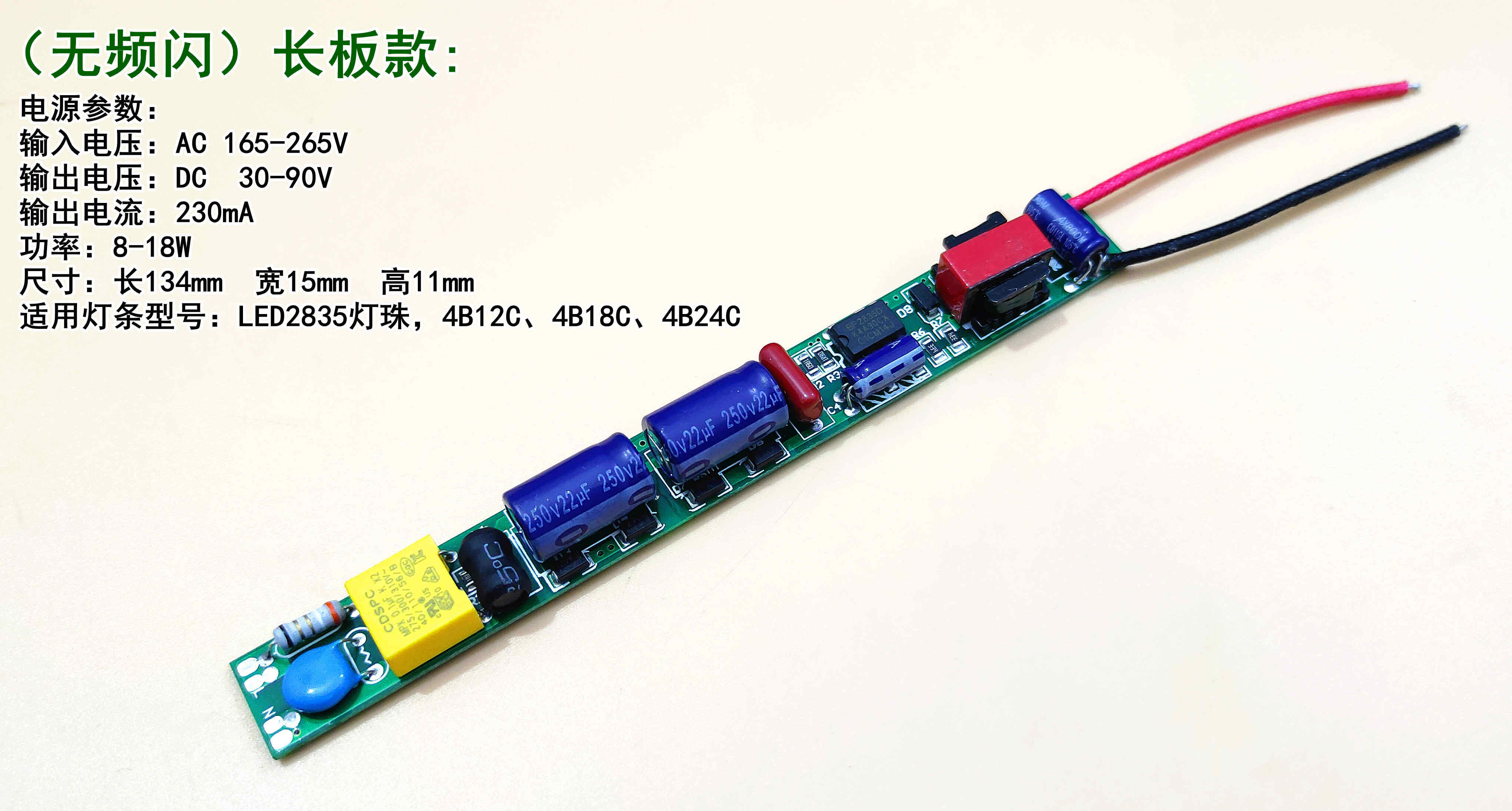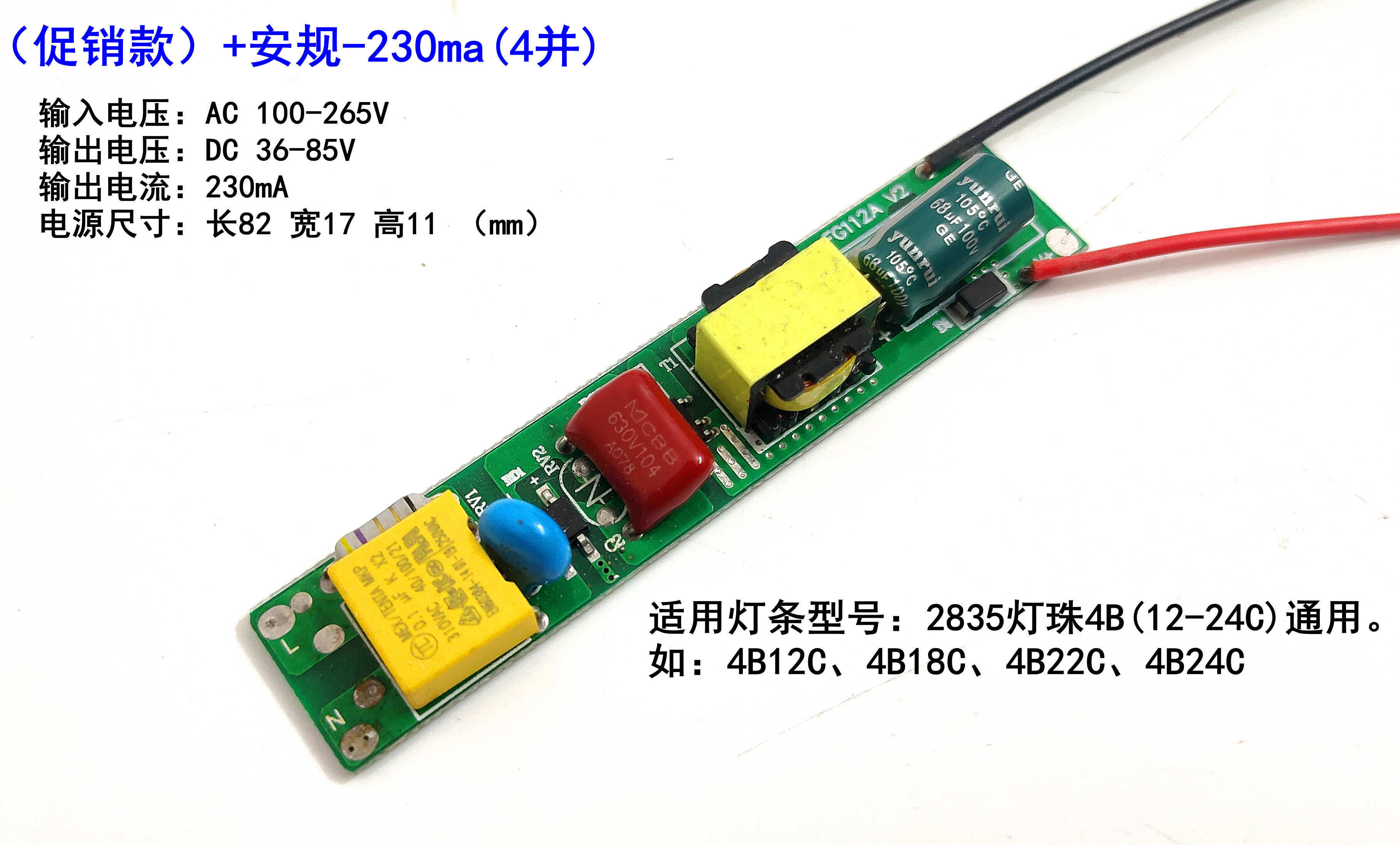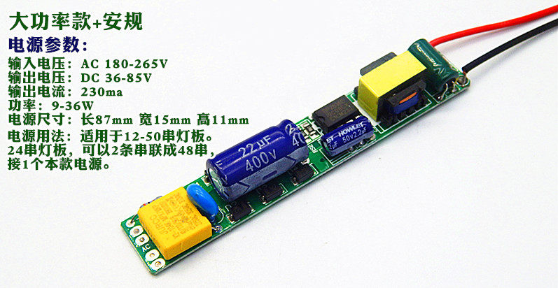 大功率款+安规款】230MA电源适用:4并12-48串灯板(4并12-48C),功率为9-36W。