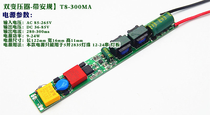 双变压器300ma电源适用:5并24串灯板(5B24C),功率为:22W。