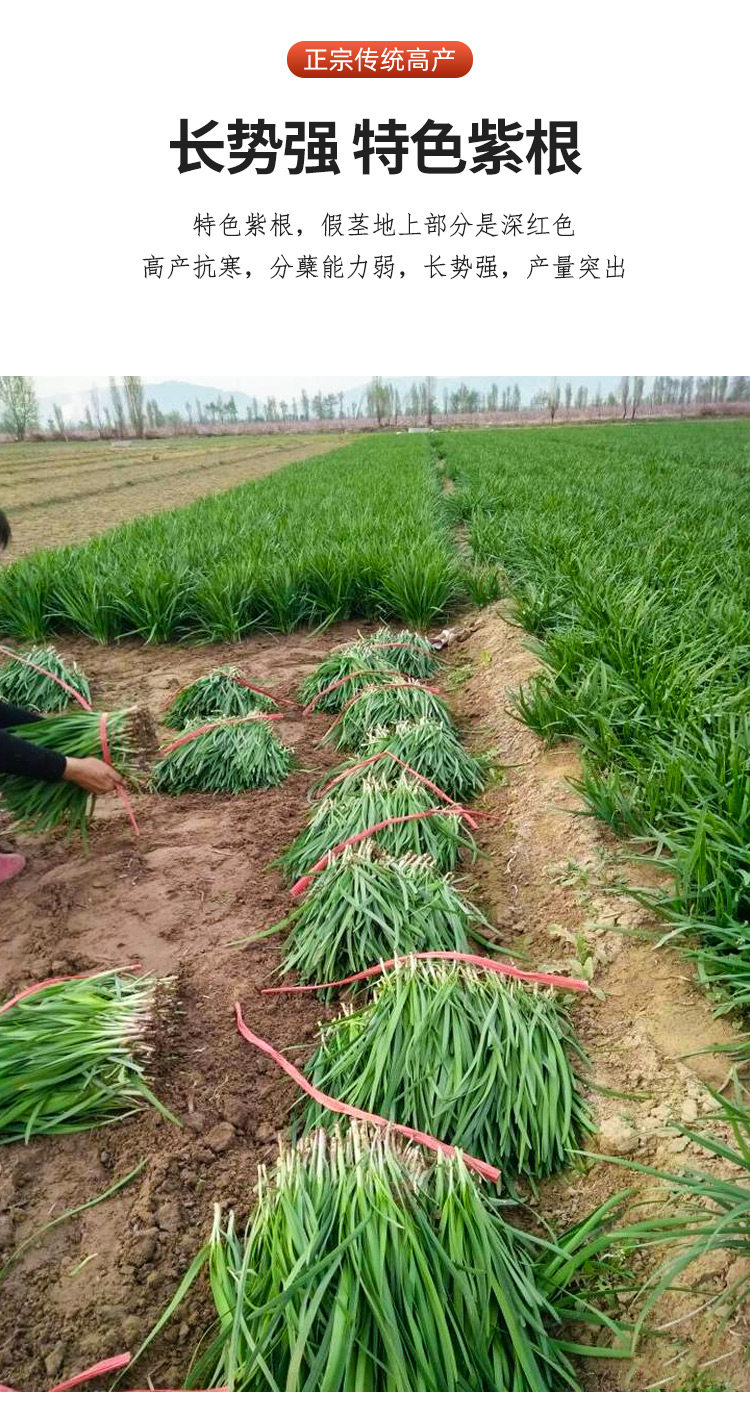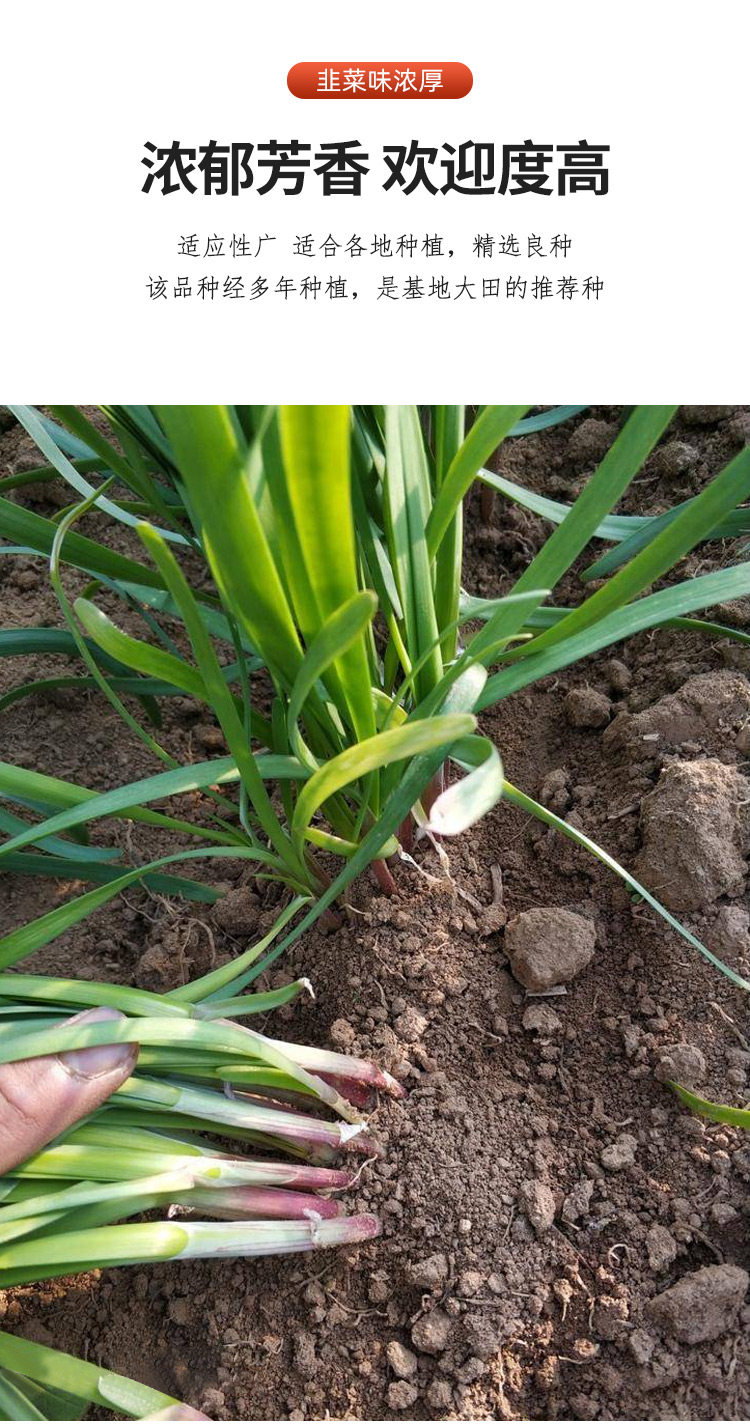 该品种根部假茎地上部分是深红色,假茎地下部分是淡红色。品味更佳,芳香性油脂含量高,香味浓,品质优。株高55c以上,株丛直立,植株生长迅速,长势强壮。叶鞘粗而长,叶片深绿色,长而宽肥厚,叶宽1.2-1.9cm左右,大单株重可达40g以上。分藥力强,多抗生理性病害,抗寒性强,耐高温高湿,无纤维,营养价值高出普通韭菜的一倍以上,商品性好,在收割后可储存72h左右,易销售。抗寒力较强,产量高,每667m2(1亩)年产可达15000kg左右。适应性广,在我国各地均宜裁培,比传统紫根韭菜高产30%以上。