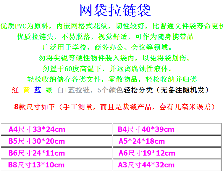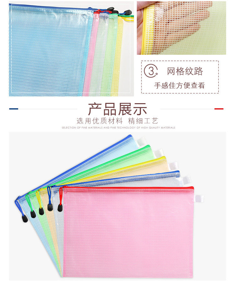 | Цветовые варианты | (A4) Сетчатый мешок: 24×33 см, (A4) увеличенный и усиленный вариант: 24,5×34,5 см, (A5) сетчатый мешок: 17,5×23,5 см, (B5) сетчатый мешок: 21×29,5 см, (A3) самый большой размер: 31,5×44 см, (B4) сетчатый мешок: 28,5×38 см, (A6) сетчатый мешок: 11,5×17,5 см, (B6) сетчатый мешок: 14×19,5 см, сетчатый конверт для документов: 11×24 см, (B8) самый маленький размер: 10×13 см. Если нужен определённый цвет, укажите это в комментариях к заказу. |