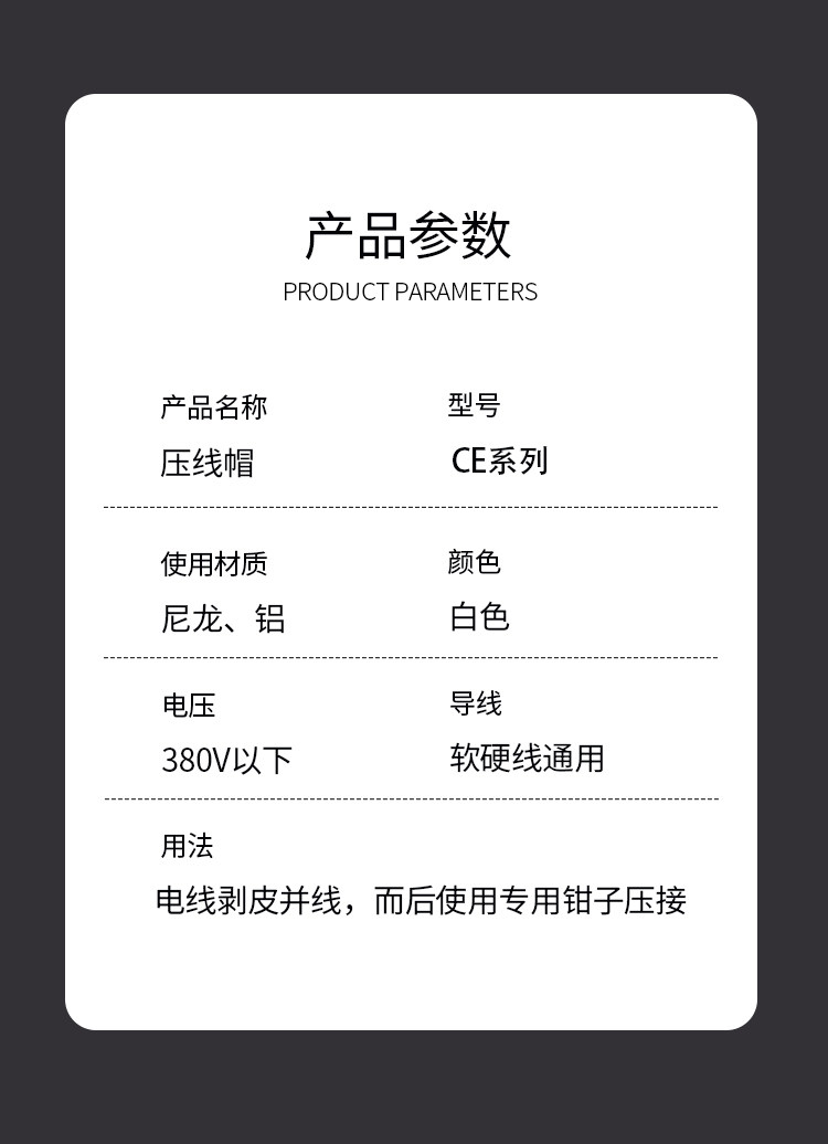 | Цветовые варианты | CE-1 (PP) 10 шт./образец, ====== Серия PP ======, CE-1 (PP) 100 шт., CE-2 (PP) 100 шт., CE-5 (PP) 100 шт., CE-1 (PP) 1000 шт., CE-2 (PP) 1000 шт., CE-5 (PP) 1000 шт., ====== Серия PA нейлон ======, CE-1 (нейлон) 100 шт., CE-2 (нейлон) 100 шт., CE-5 (нейлон) 100 шт., CE-1 (нейлон) 1000 шт., CE-2 (нейлон) 1000 шт., CE-5 (нейлон) 1000 шт., CE-1 (медная трубка нейлон) 100 шт., CE-2 (медная трубка нейлон) 100 шт., CE-5 (медная трубка нейлон) 100 шт., CE-1 (медная трубка нейлон) 1000 шт., CE-2 (медная трубка нейлон) 1000 шт., CE-5 (медная трубка нейлон) 1000 шт., ====== Серия PA нейлон огнеупорный с высокой температурой ======, CE-1X (алюминиевая трубка 750°C огнеупорная) 1000 шт., CE-2X (алюминиевая трубка 750°C огнеупорная) 1000 шт., CE-5X (алюминиевая трубка 750°C огнеупорная) 1000 шт., CE-1X (медная трубка 750°C огнеупорная) 1000 шт., CE-2X (медная трубка 750°C огнеупорная) 1000 шт., CE-5X (медная трубка 750°C огнеупорная) 1000 шт., CE-8 (нейлон) 500 шт., Клещи для колпачков HS-6M |