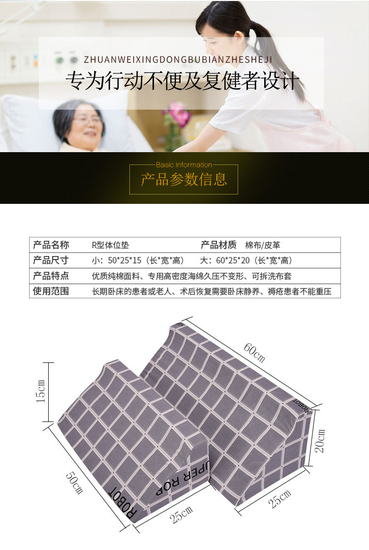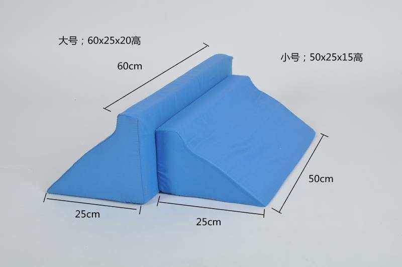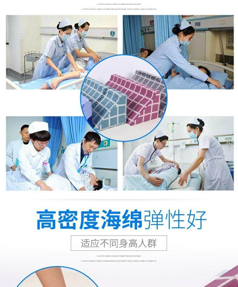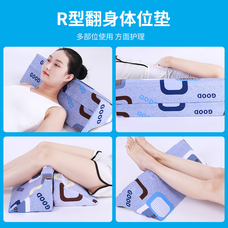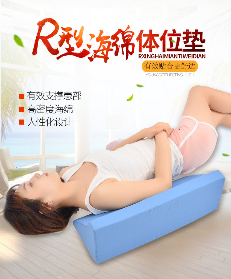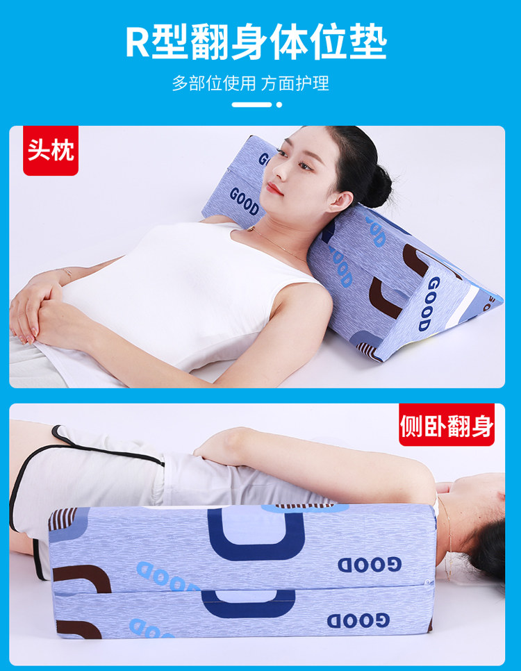 1、长期平躺会对臀部、背部凸出部位造成长时间压迫,血液不循环,极易形成褥疮,给病人带来危害。定时的侧卧能分散这些部位的体压,预防褥疮的产生。但是,侧卧的角度并不是越大越好(这个与孕妇左侧位睡觉的目的有些不同的,孕妇侧卧为了保护胎儿和自身内脏的正常生理机能,所以侧卧接近90度也可以,因为累了,自身有知觉可以调整睡姿),失去知觉或难以行动的病人或老人则完全不同,如果角度过大势必会造成侧部髋骨等突出骨承重太大,形成侧部的褥疮,适得其反。正确的角度是30度左右为好,本R型垫的角度是比较合适的。