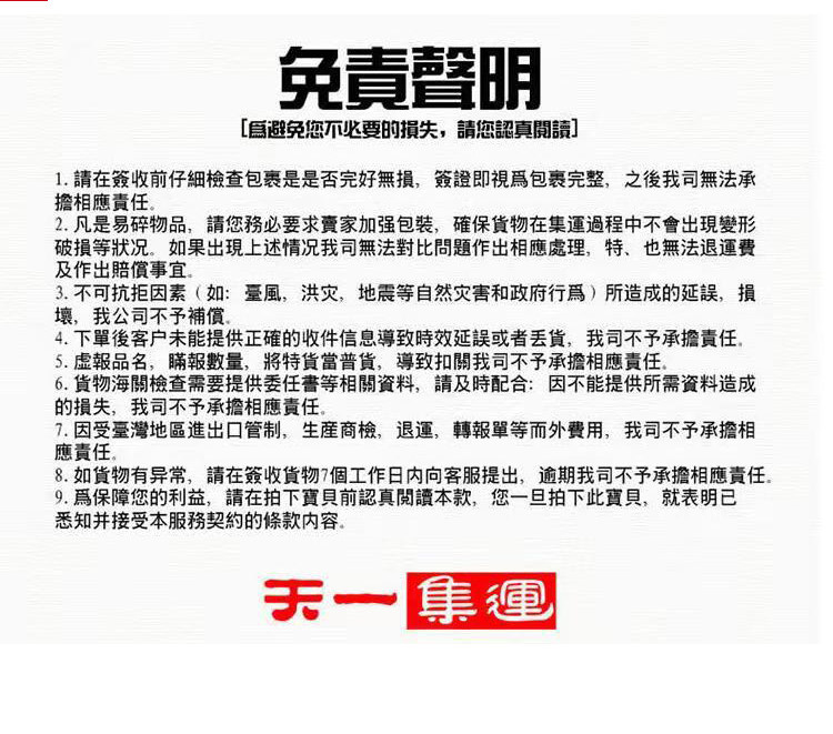 溫馨提示:臺灣件免費存倉三個月,超期按倉庫入庫時間起算收取存倉費,按1元每件每天計,最長為半年,半年後如果無特殊原因提前請我們保留將視為自動放棄物品。貨品將銷毀,不另行通知。因此帶來的不便,深感抱歉~同時謝謝您的理解與支持~