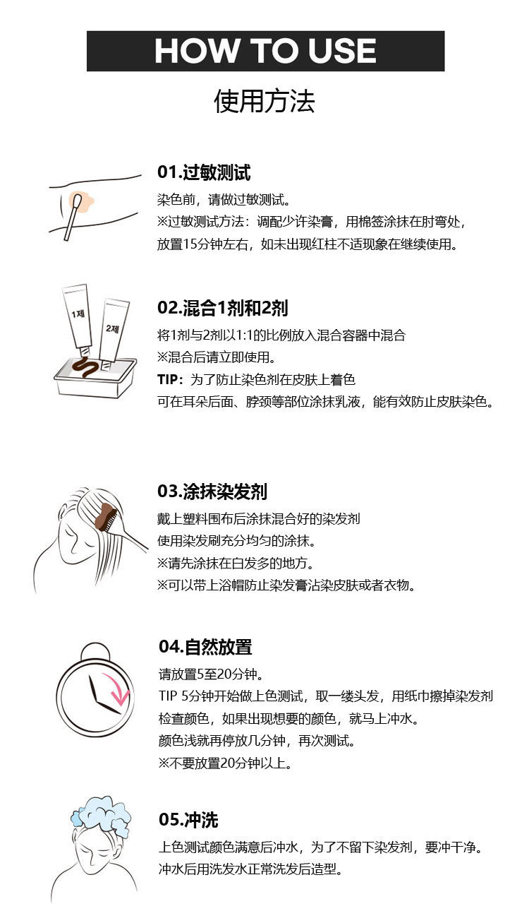 1.先将1剂和2剂按1:1混合后,进行染发操作,先涂抹白发最多的部位,然后再涂其他部位。
