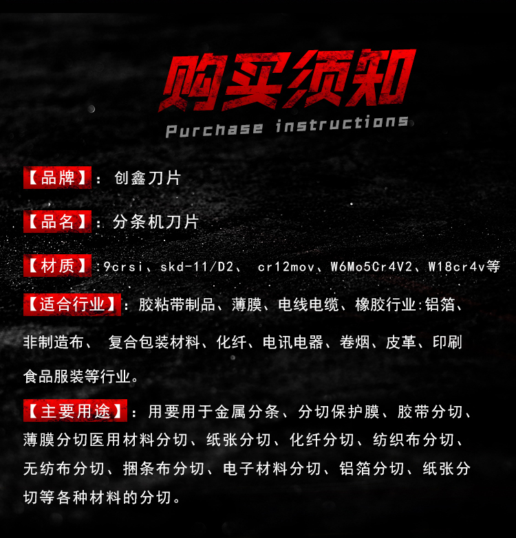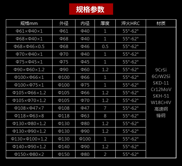 | Color Options | Non-standard custom size (special order note), 9CrSi/105*70*1.2 (10 pcs), Imported alloy 105*70*1.2 (10 pcs), SKD-11/105*70*1.2 (10 pcs), D2/105*70*1.2 (10 pcs), Standard hardness W6Mo5Cr4V2 105*70*1.2 (10 pcs), W6Mo5Cr4V2 105*70*1.2 (10 pcs), Standard SKH-51/105*70*1.2 (10 pcs), SKH-51/105*70*1.2 (10 pcs), High-speed steel W18Cr4V 105*70*1.2, 65*40*0.5 (10 pcs) SKD-11, 65*40*1 (10 pcs), 68*46*0.5 (10 pcs), 65*45*1.2 (10 pcs) SKD-11, 68*40*1 (10 pcs), 75*45*1 (10 pcs), 90*60*1.2 (10 pcs), 98*66*0.8 (10 pcs), 100*66*0.8 (10 pcs), 100*66*1.2 (10 pcs), 105*65*1.2 (10 pcs), 100*65*1.2 (10 pcs), 100*70*1.2 (10 pcs), 105*60*1.2 (10 pcs), 105*75*1.2 (10 pcs), 108*70*1.2 (10 pcs), 108*75*1.2 (10 pcs), 110*70*1.2 (10 pcs), 110*75*1.2 (10 pcs), 118*80*1.2 (10 pcs), 120*85*1.2 (10 pcs), 125*85*1.2 (10 pcs), 130*80*1.2 (10 pcs), 130*80*1.5 (10 pcs), 130*90*1.2 (10 pcs), 140*90*1.2 (10 pcs), 140*95*1.2 (10 pcs), 150*80*2 (10 pcs), 180*70*2.5 Imported high-speed steel, Spring 210*3.2 (20 pcs), D2 high-speed steel 150*90*2/3, 150*90*2/3 (10 pcs), Flat round blade 90*60*1.2, Bowl-shaped blade 150*80*2.5, 180*70*5 Imported high-speed steel, 56*32*15, 56*28*15, 56*30*15, 56*35*15, 80*45*19, 80*50*19, 80*55*19, 80*60*19, 90*65*20, 92*60*20, Thick 92*60*20, 92*65*20, 105*60*20, 105*65*20, 105*70*20, 100*70*20, 80*45/50/55*10, 60*40*5/3, 70*28*14/12, 70*30*15/13, 70*45*5/3, 70*45*10/8, 70*45*20/16, 70*50*10/8, 80*40*20/16, 80*45*20/16, 80*50*5/3, 80*50*10/8, 80*50*20/16, 80*50*30/30, 80*55*5/3, 80*55*8/10, 80*55*20/16, 80*55*30/30, 80*60*10/8, 90*60*5/3, 90*60*10/8, 90*60*20/16, 90*65*5/3, 90*65*10/8, 90*65*20/16, 90*65*25/21 (23), 90*65*30/30 (26), 92*65*5/3, 92*65*6/4, 92*65*8/6, 92*65*10/8, 92*60*30/28, 90*70*20/16 (18), 90*70*25/21 (23), 90*70*30/26, 100*70*5/3, 100*70*10/8, 100*70*20/16, 100*70*25/21, 105*80*5/3, 105*80*8/10, 105*80*20/16 (20) (18), 105*80*30/26, 105*76*10/10, 105*90*10/8, 105*60*15/13, 108*80*5/3, 108*80*10/8, 108*80*20/16 (18), 108*80*30/26 (28), 108*76.2*35/33, 120*90*10/8, 50*19*6/3, 76*17*5/2, 76*19*6/3, 76*22*6/3, 105*65*11 (3 holes), 105*65*11 (4 holes), 118*65*8, 108*47*8, 108*47*20, 152*140*50, 70*32*15, 70*28*15, Size note special order (stacked quantity), Standard high-speed steel W18Cr4V 105*70*1.2 |